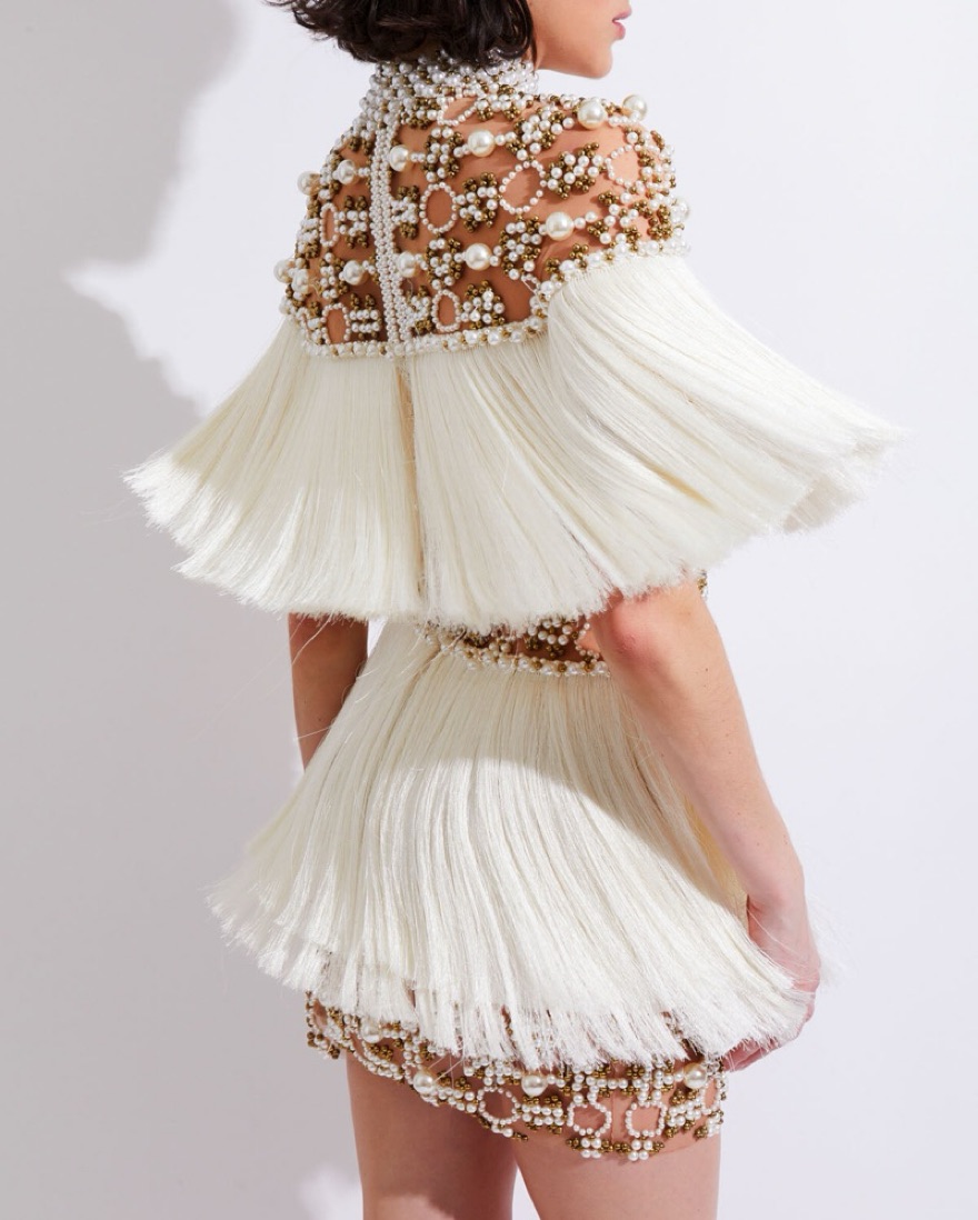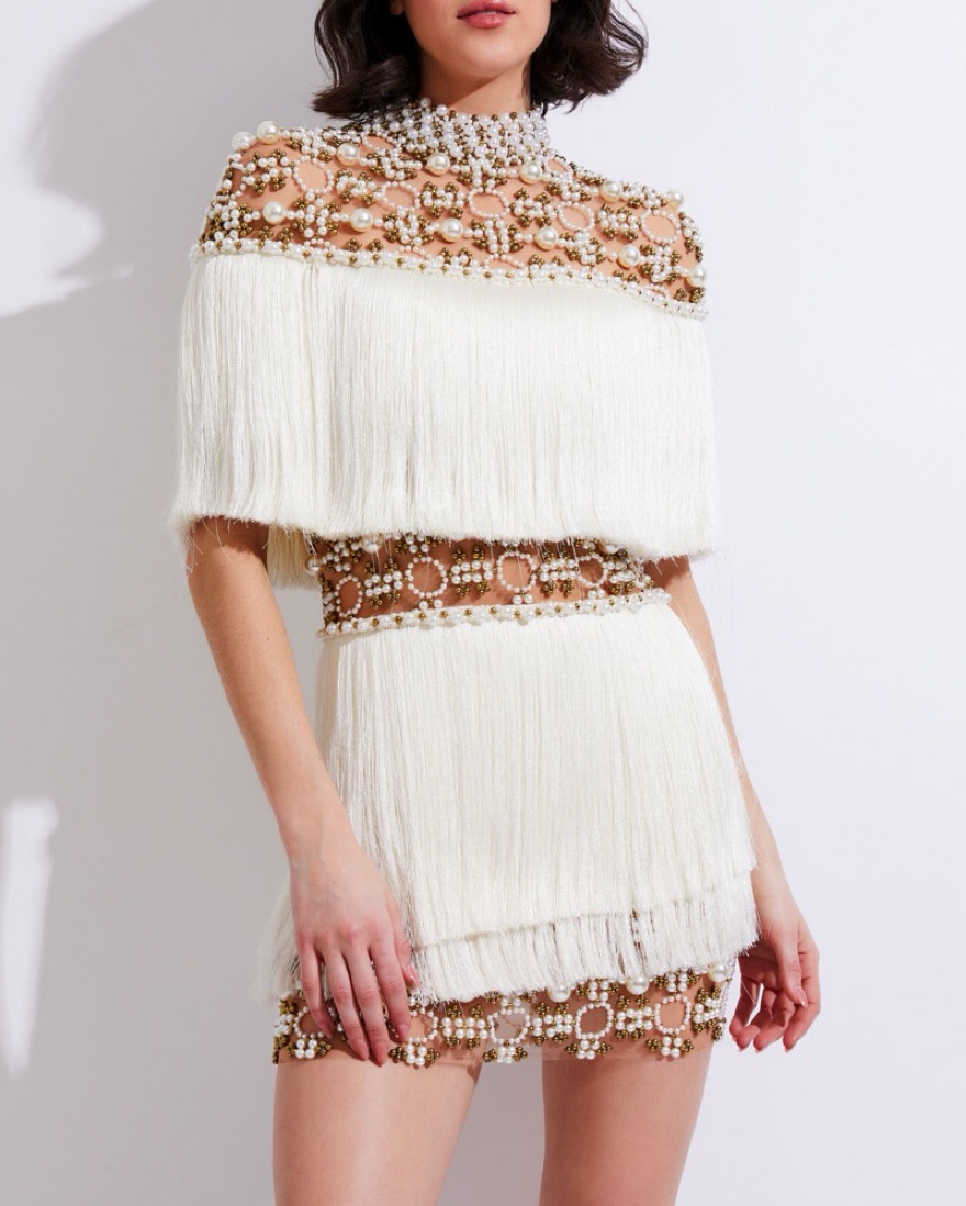 I have NEVER gotten so many compliments about a dress!! Insanely flattering! I wore it at my wedding and it was perfect. I usually wear a 4/6 but this dress runs small, so I got an 8 and it was great! Hand-Beaded Pearl and Fringe Mini Dress features intricate beading at décolleté, waist and hem.