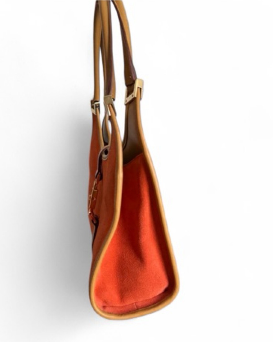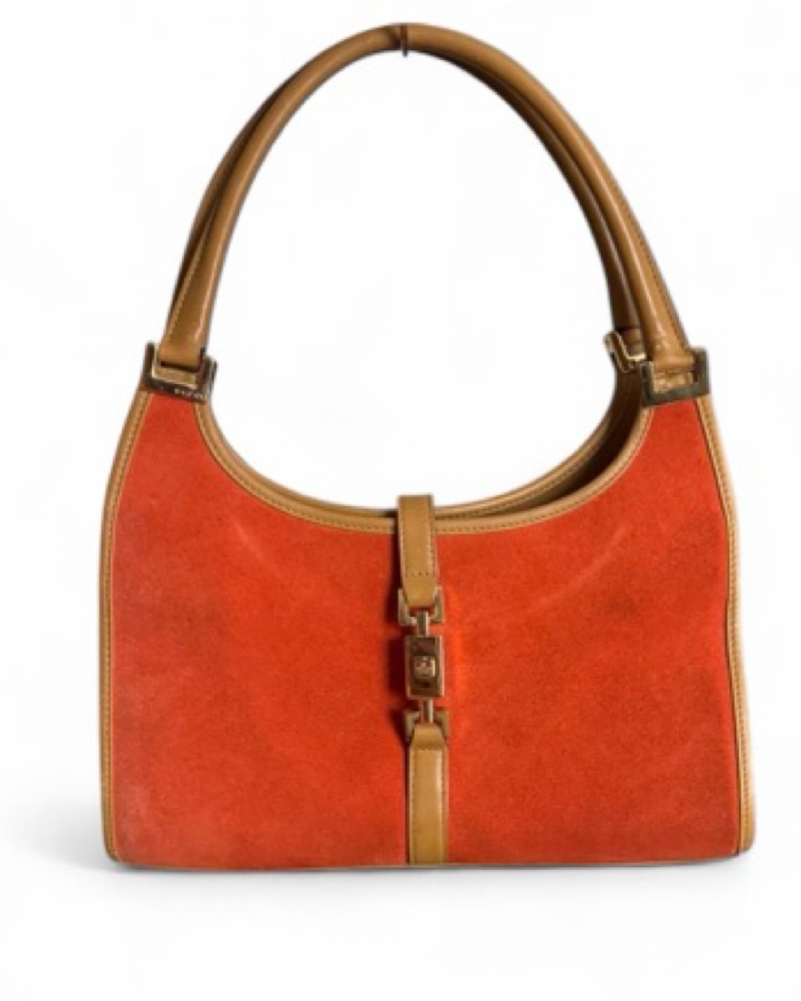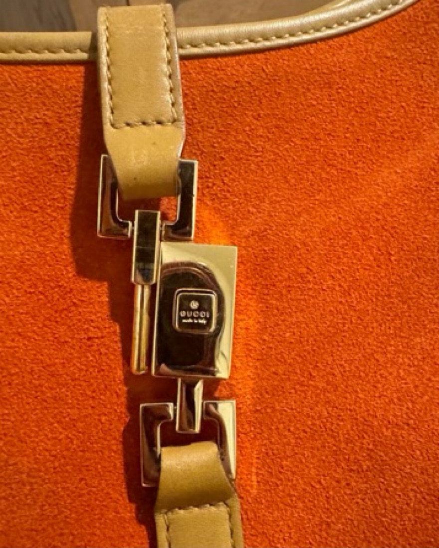 Vintage orange suede Jackie Bardot bag by Gucci from the 70s. Great vintage condition minus some instances of discoloration, minor scratching to hard wear and wear to leather handles.