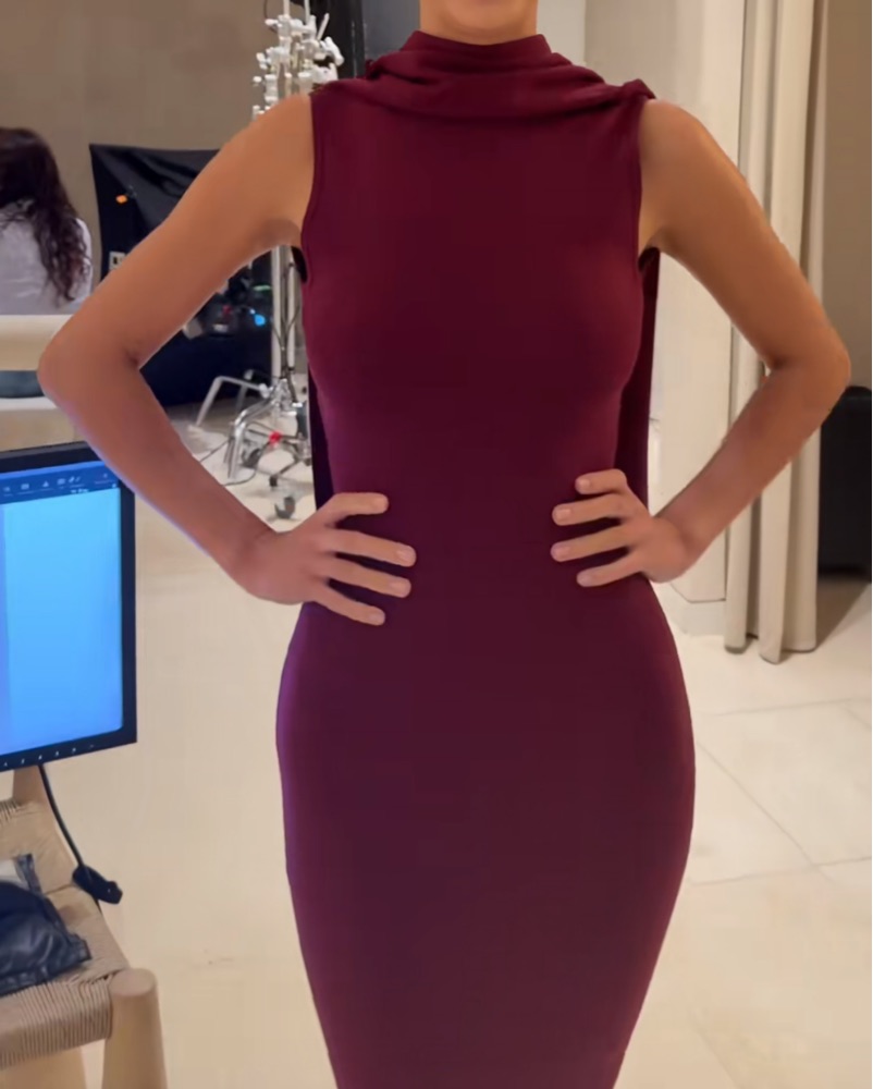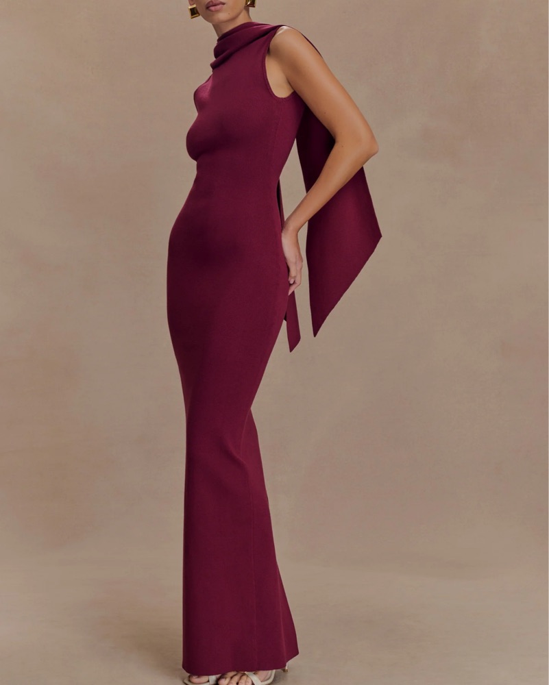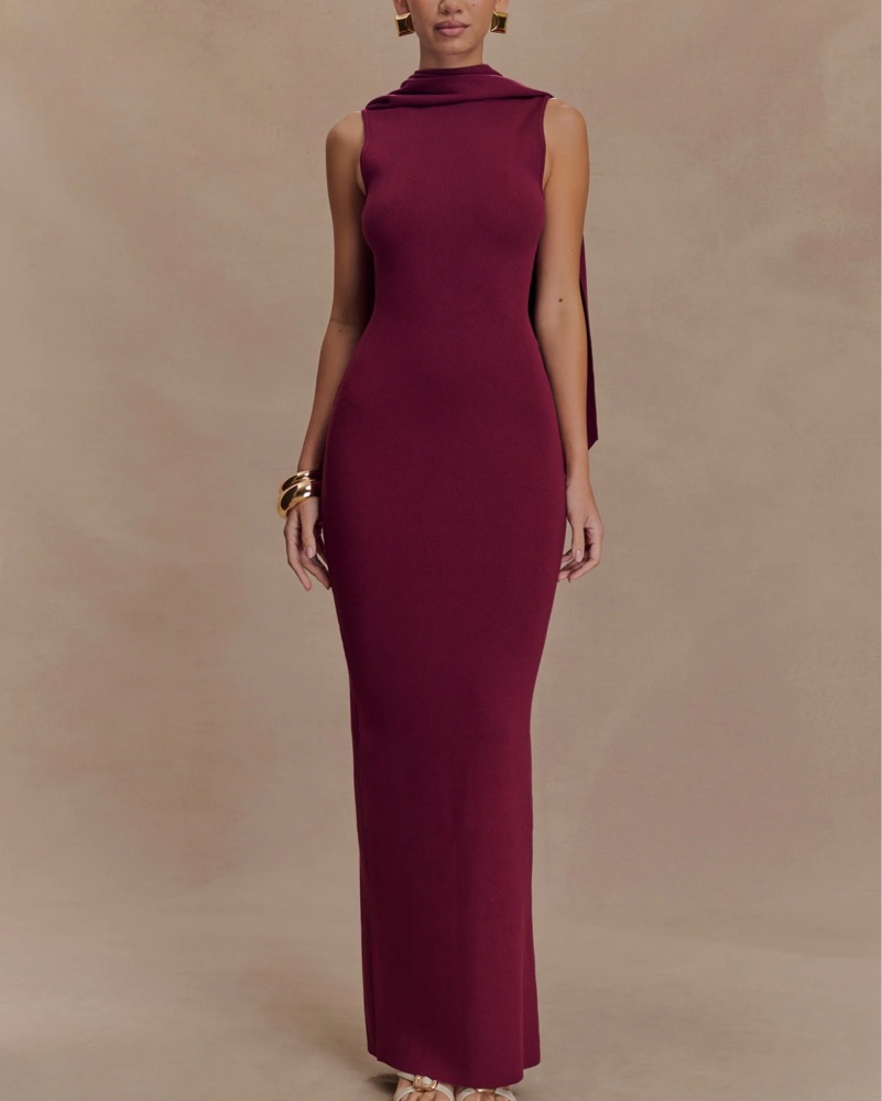 Merlot color perfect for holiday parties and office appropriate. Featuring a sleeveless, fitted silhouette and open back, this maxi-length style is finished with a back vent for ease of movement. The attached scarf neckline adds a soft, statement-making touch—whether tied, draped, or styled your way