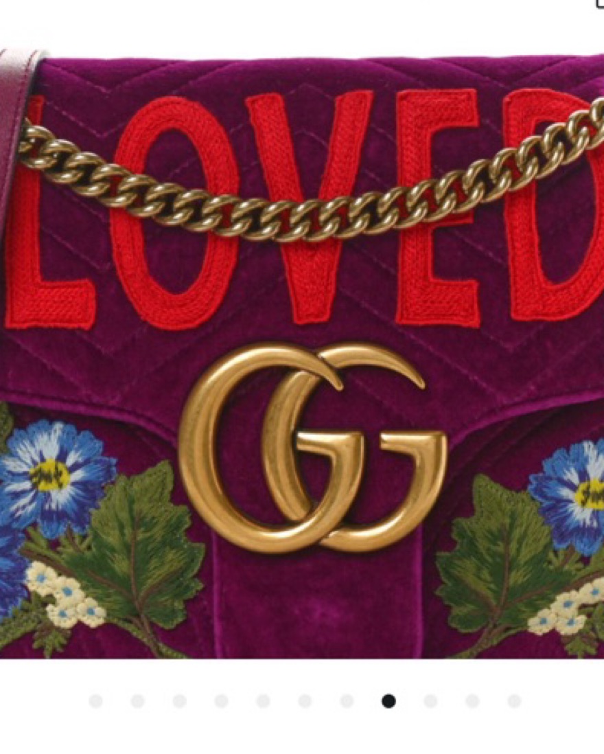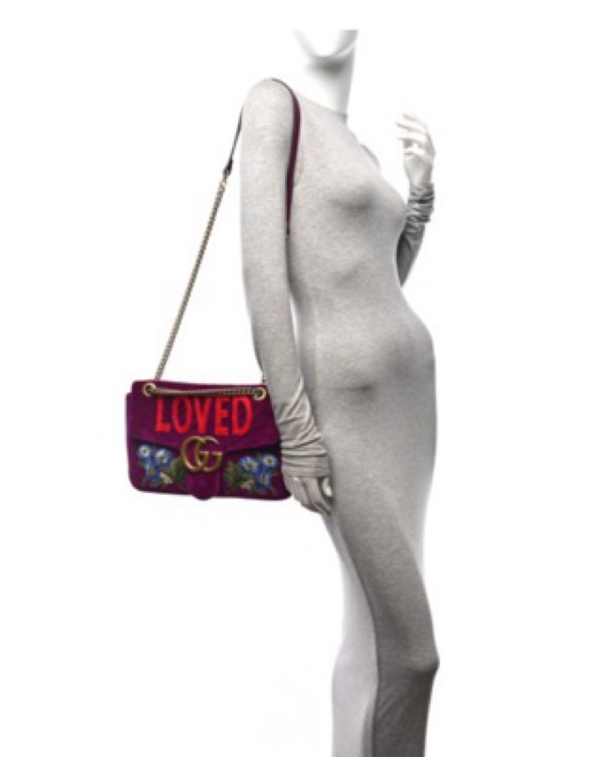 GUCCI Velvet Matelasse Loved Embroidered Medium GG Marmont Shoulder Bag in Fuchsia and Violet Cyclamen. This shoulder bag is crafted of soft velvet in purple with embroidery of the word LOVED and a long aged-gold chain shoulder strap.