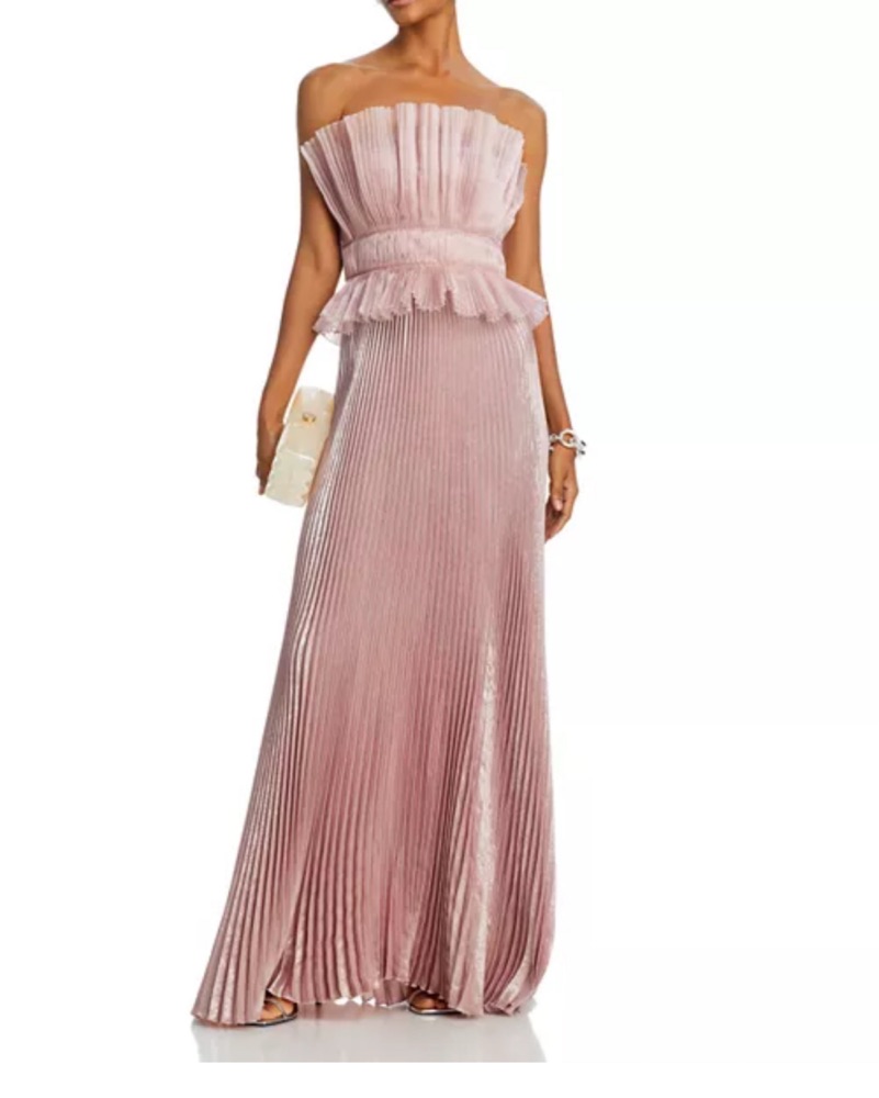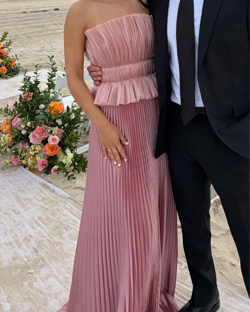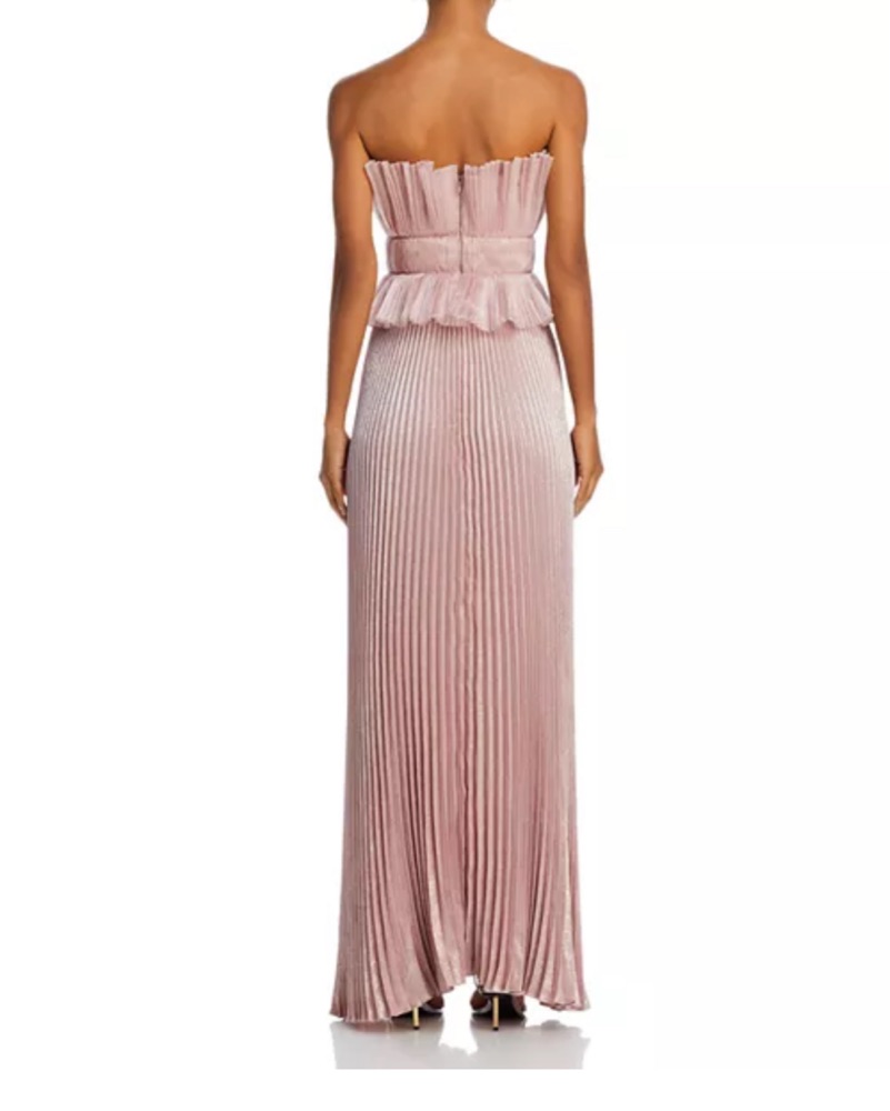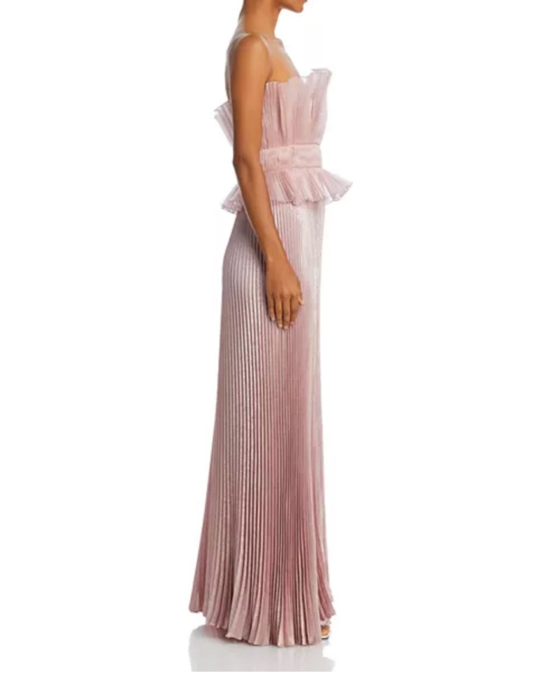 Size: 0 US / 4 AU, Color: Parfait, Originally: $599. Elegant strapless gown featuring a flowing pleated skirt. Zipper closure at back. Dry cleaned before delivery. Please handle with care and dry clean before returning.