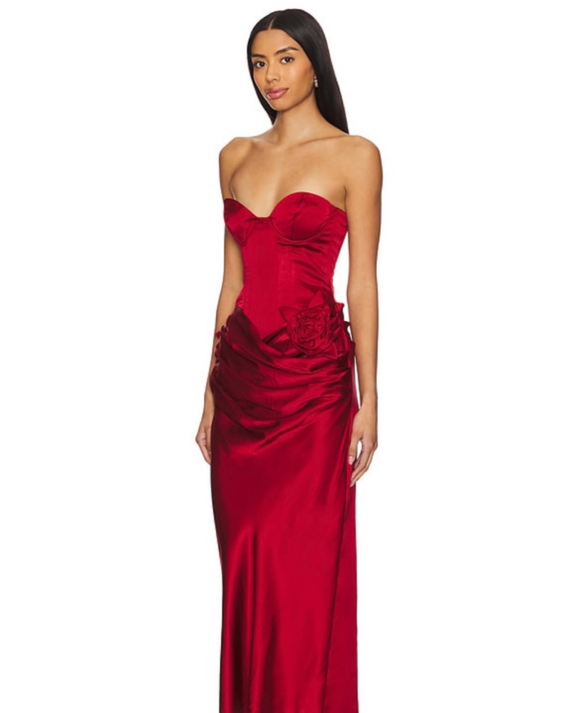 Got so many compliments on this dress! Perfect for any formal occasion. There has been some wear and tear from past rentals so there is a small stitch due to a rip near the rose at the front