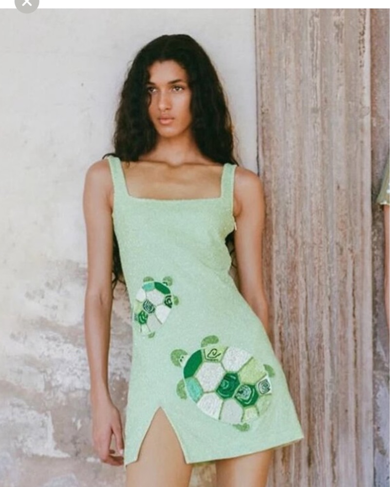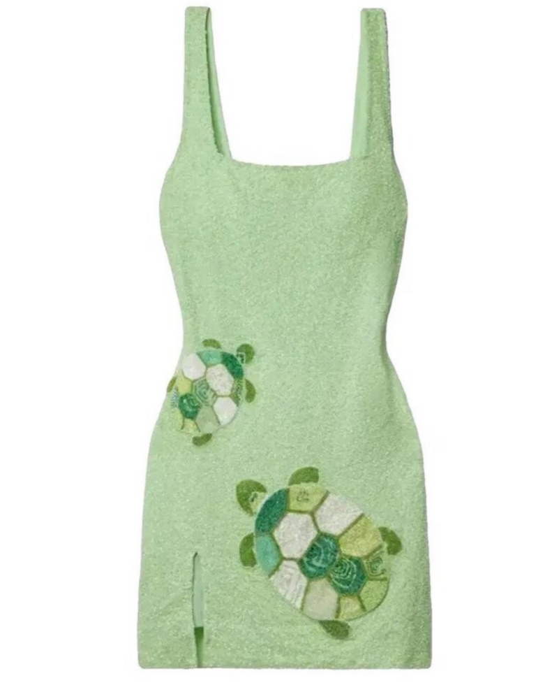 Styled with a square neck and front slit, Staud's sleeveless Le Sable minidress flaunts a whimsical beaded turtle motif.