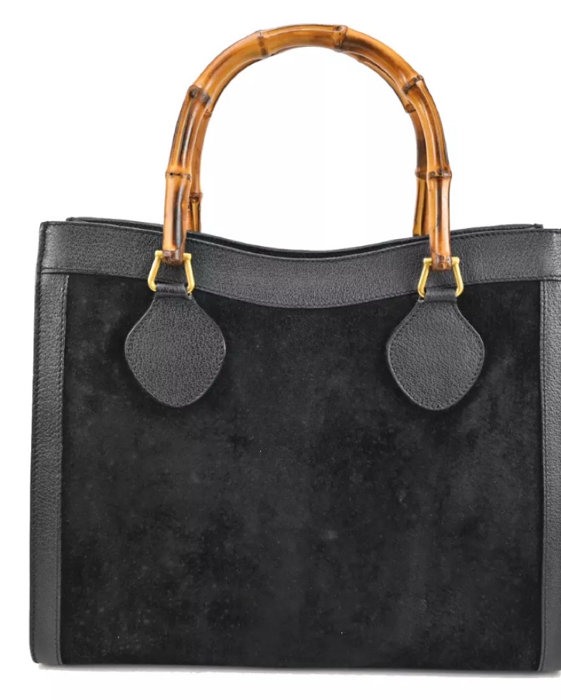 Black suede tote with bamboo handles. Authentic vintage Gucci. First photo is actual bag (2nd is princess Diana with hers that Gucci eventually named for her.)