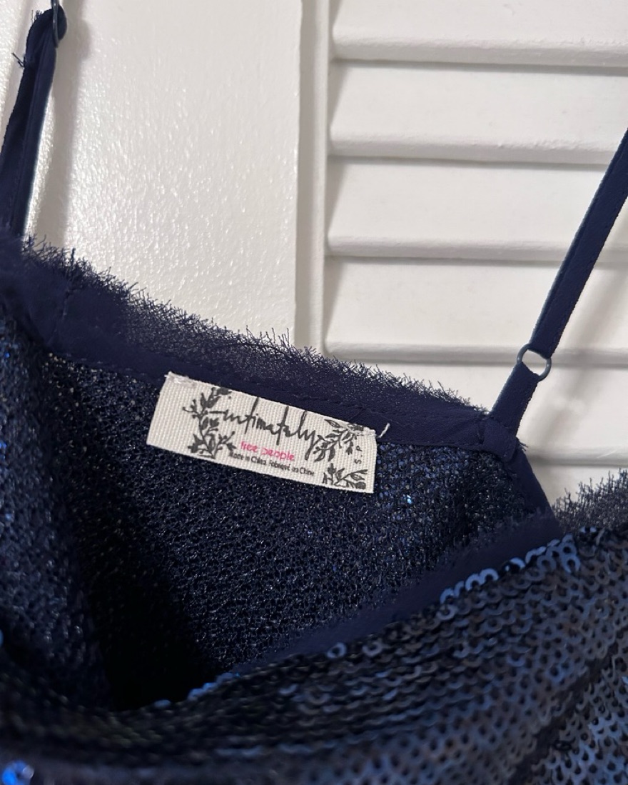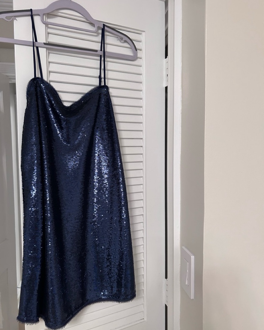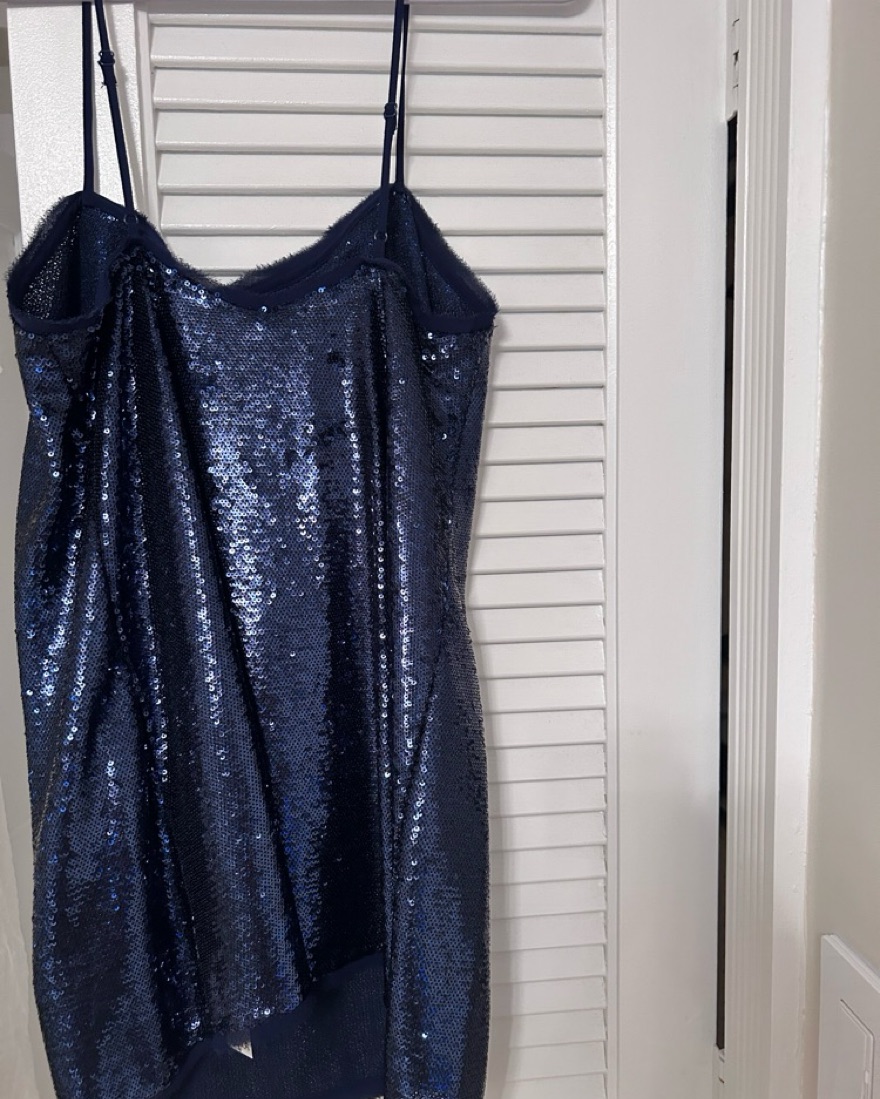 Perfect condition (worn once) sparkling navy sequin slip featured in an A-line silhouette with raw-edge hems. Adjustable shoulder straps, perfect for a themed bachelorette or a winter party!