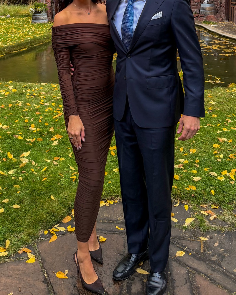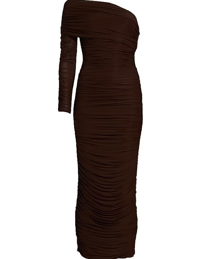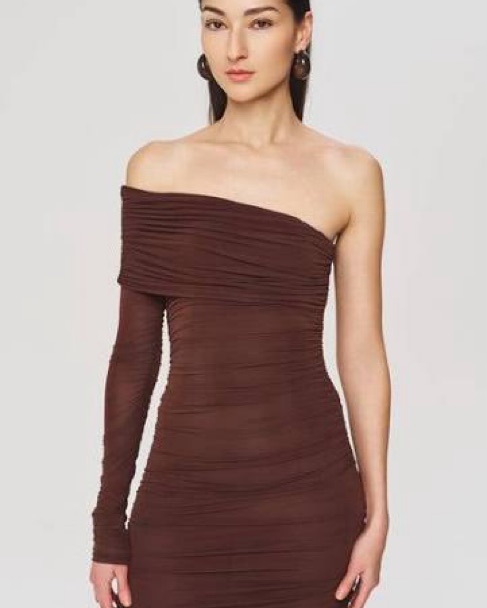 Ronny Kobo Sylvan dress in color “Chicory”, a rich chocolate brown. Chic one-shoulder design - perfect for elegant evenings or a fall wedding.