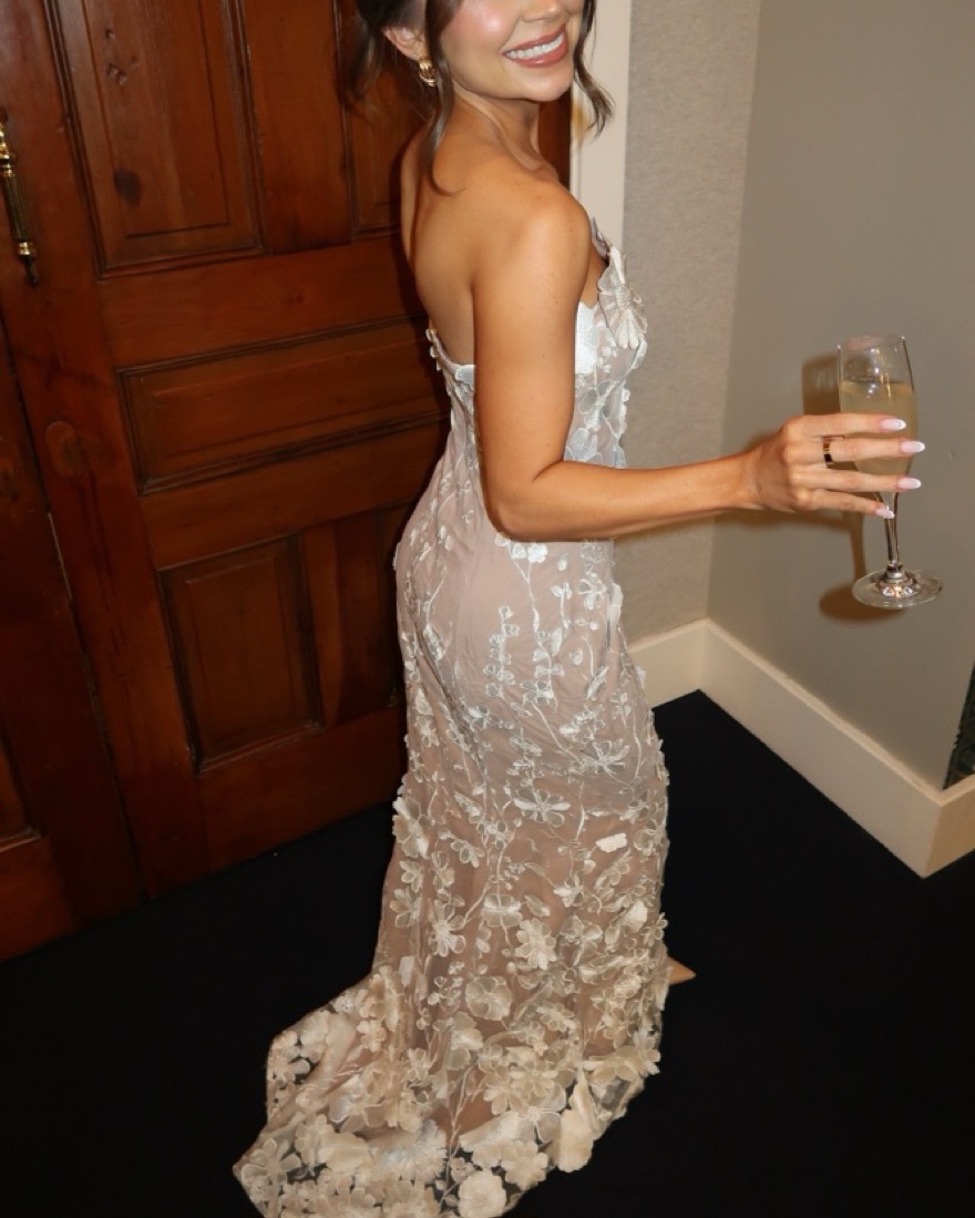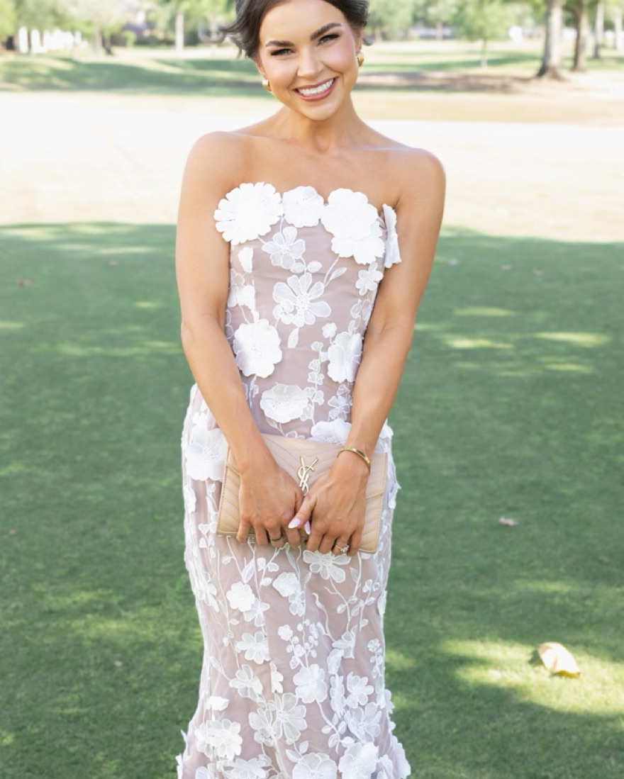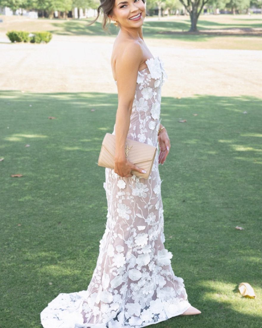 This stunning lace maxi dress is perfect for any formal event or special occasion. The delicate floral appliques and sheer fabric create a truly romantic look.