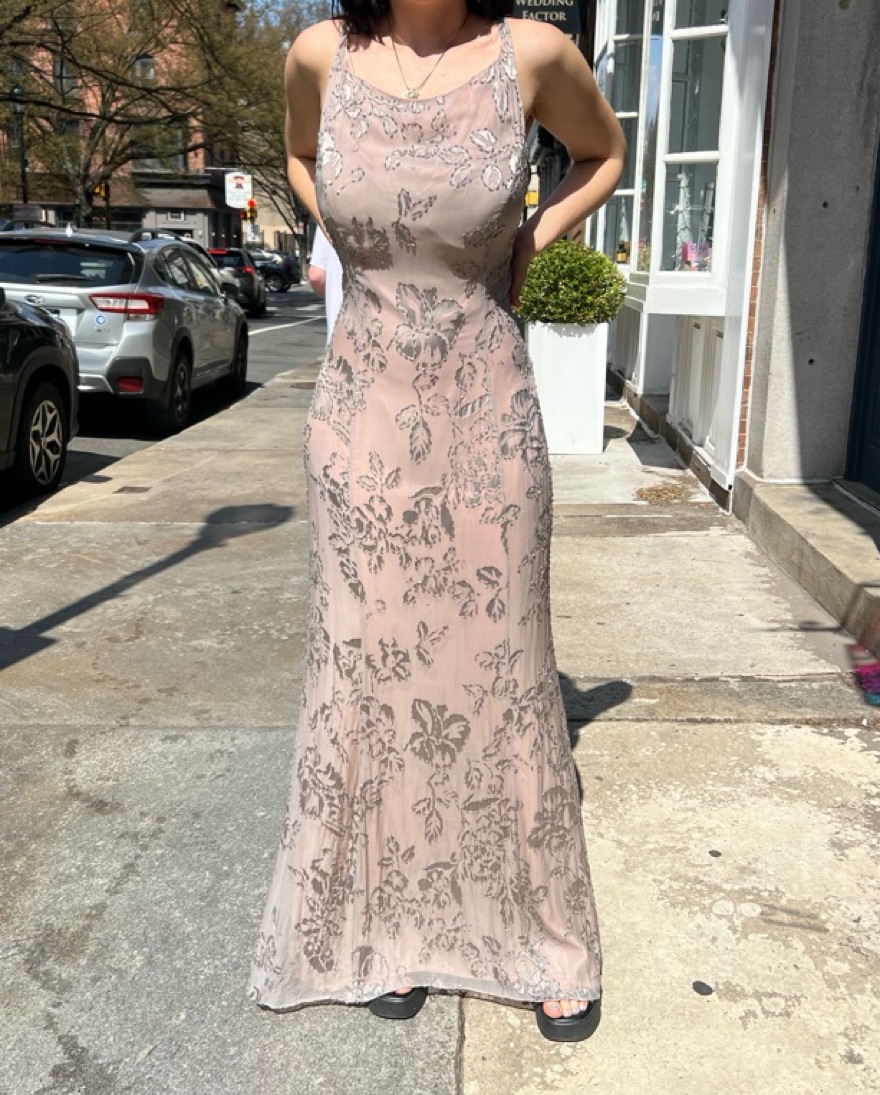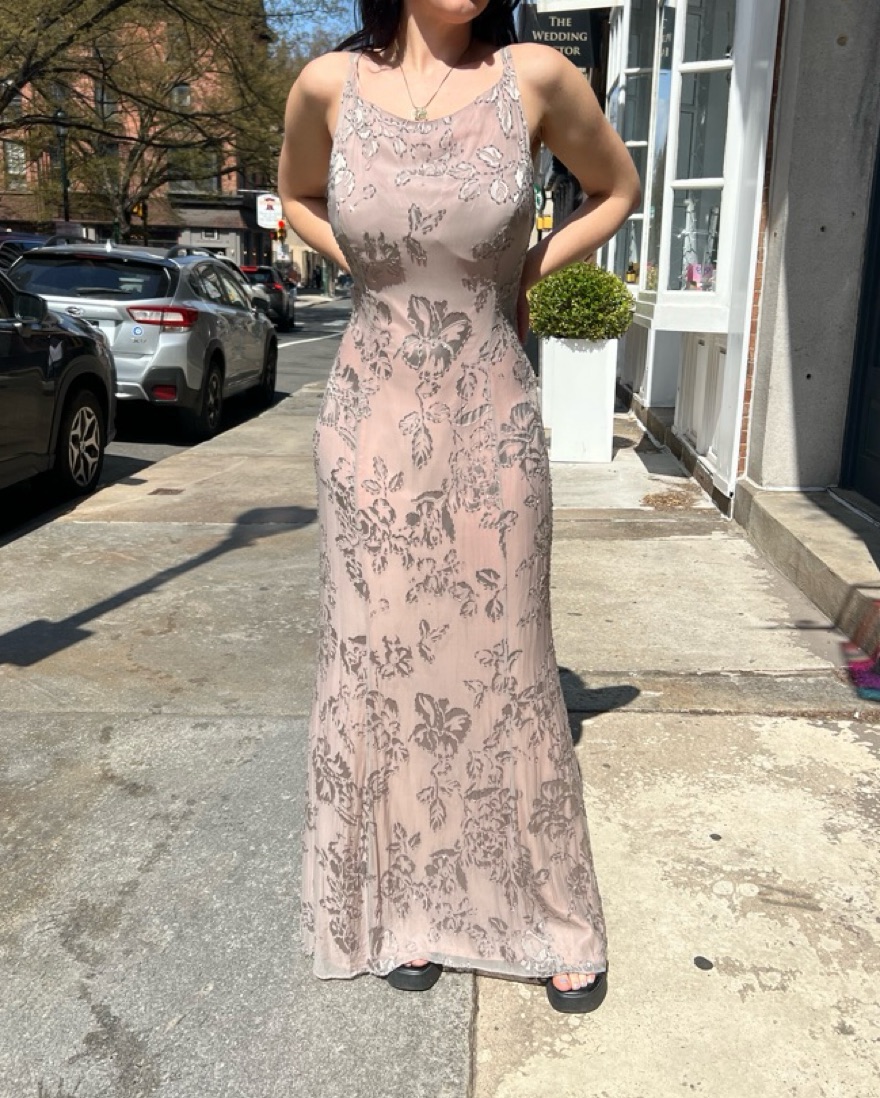 Vintage bias cut silk full length gown. Features a grey silk overlay and muted pink lining. Intricate floral beading through out and criss crosses in the back. Marked as a 12