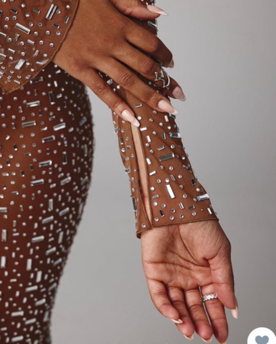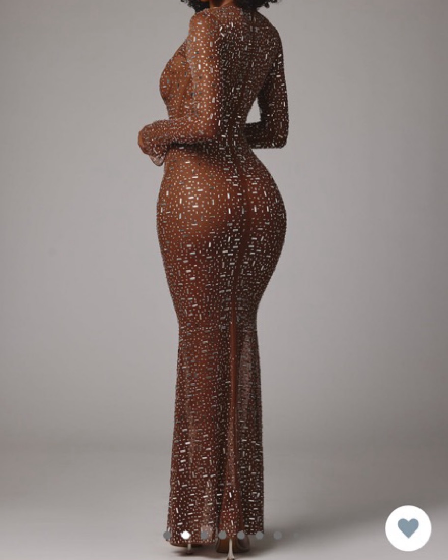 Oh Polly Isabeau sheer embellished long sleeve evening gown in mocha with mini liner included in rental in mocha as well. Memorable moments call for spectacular evening wear. Brand new, never worn.