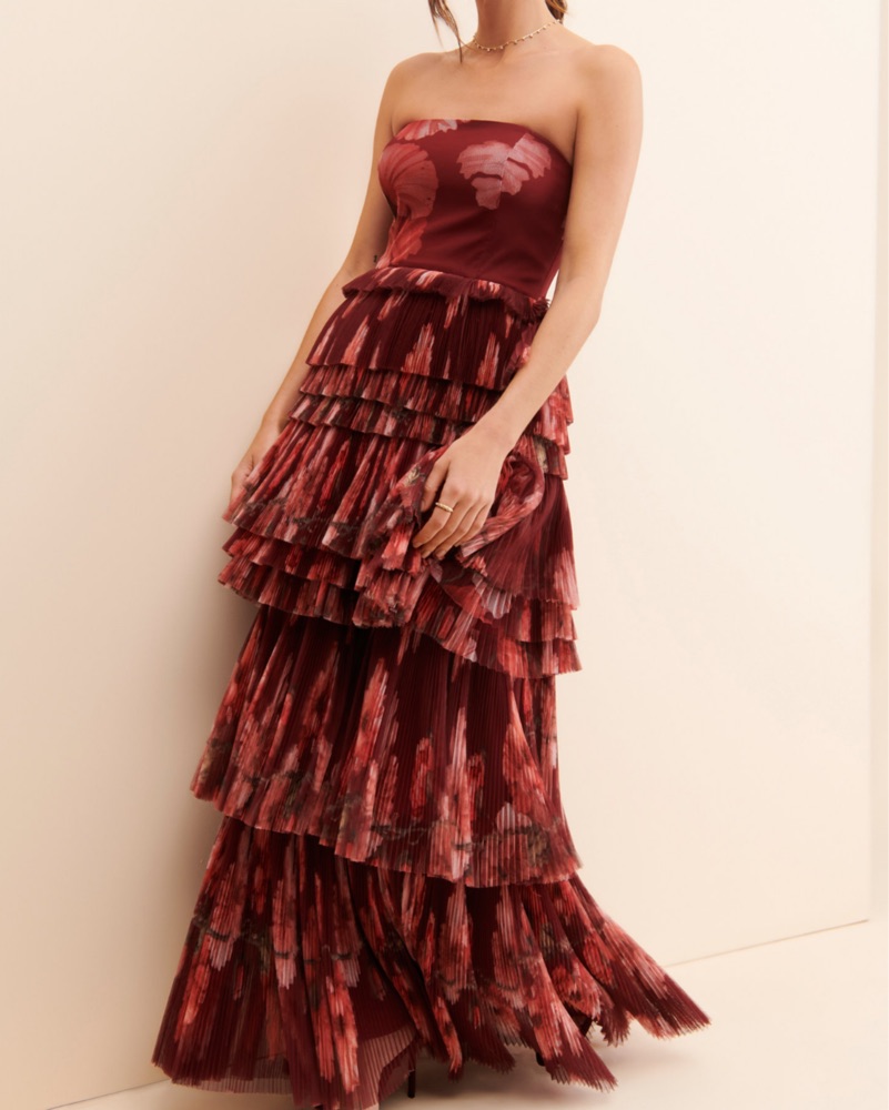 Floral maxi tiered ruffle dress. Perfect for fall/winter events and black tie or black tie optional weddings! Can fit xs and small!