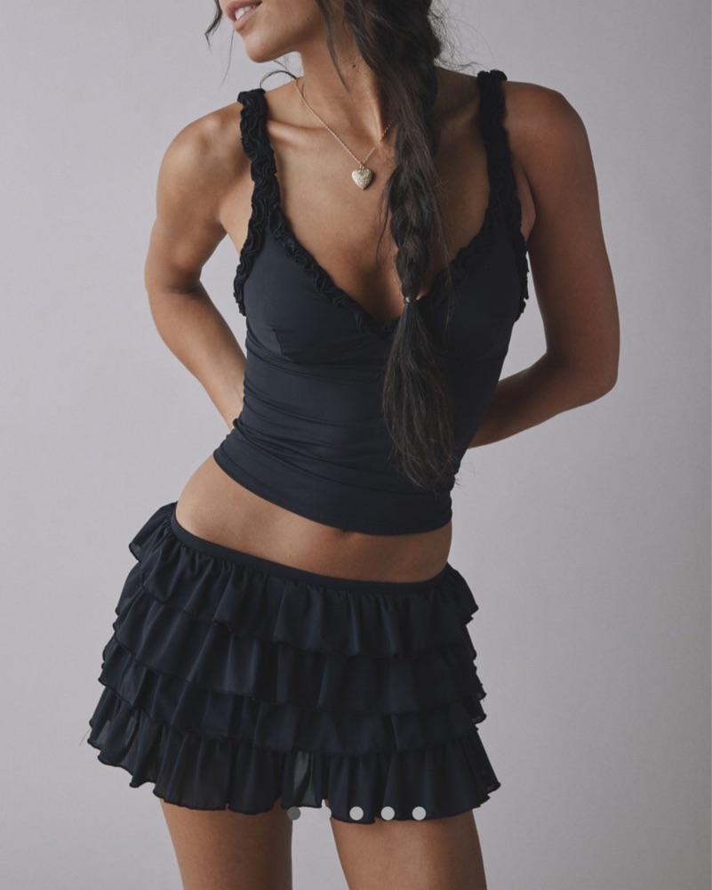 This UO Out From Under Black Set Includes and the Cammy Ruffle Trim Mesh Tank Top and the Cammy Ruffle Trim Micro Skort. Both pieces are a size small and have been worn once! I will delicately handwash the set upon return back to me.