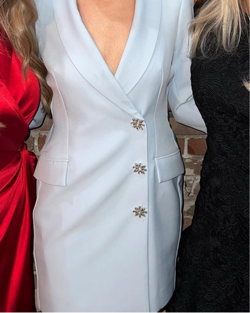 This stylish pastel blazer dress is perfect for a chic daytime event or evening soiree. The structured silhouette and embellished buttons add a touch of sophistication.
