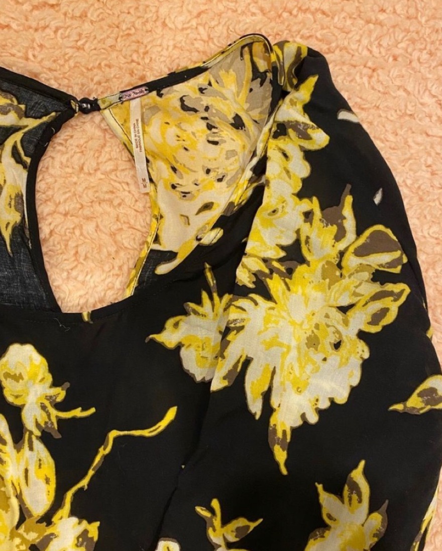 Size Medium Free People First Kiss black and yellow floral maxi dress. Missing one button on the back but otherwise in new condition. Long-sleeved floral printed maxi. Super flattering! Perfect for wedding guest or formal events!