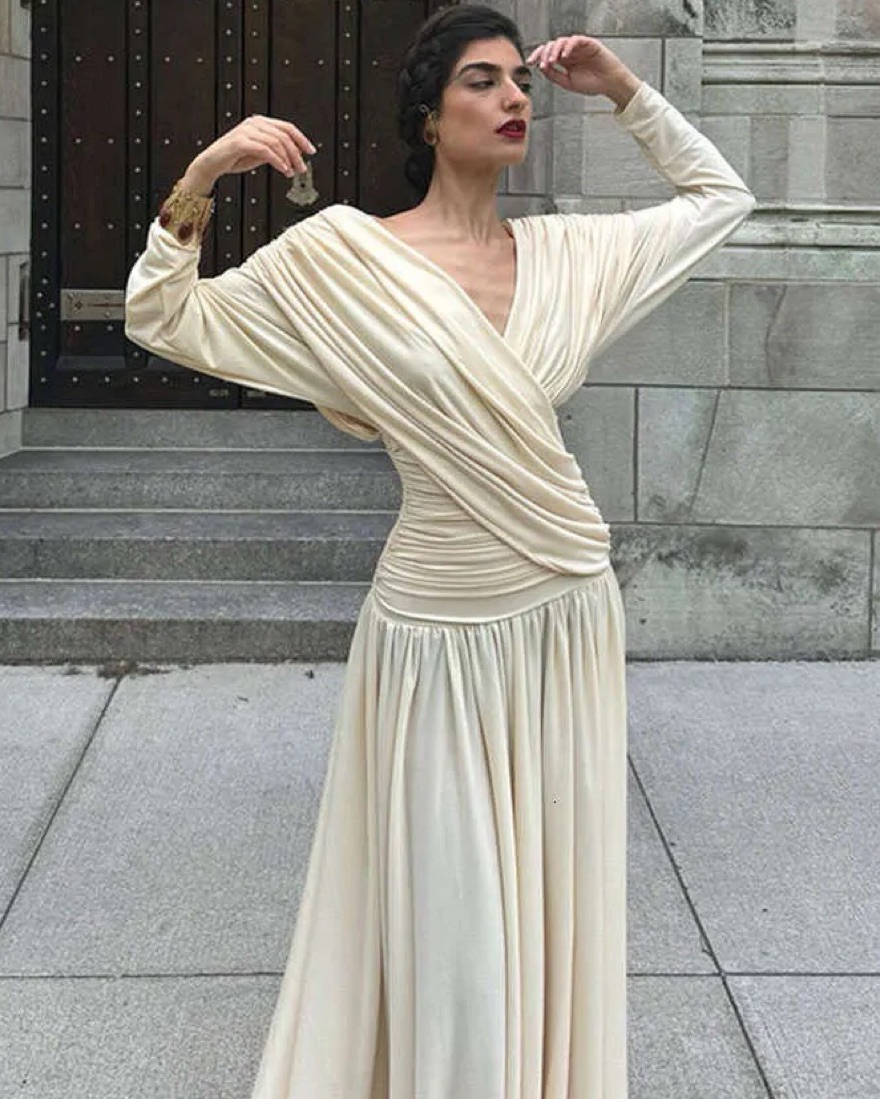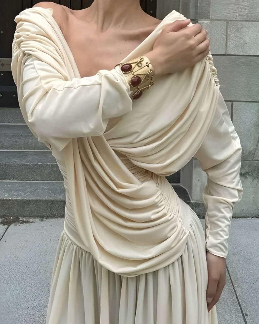 A beautiful draped dreamy dress! I received so many compliments on it.