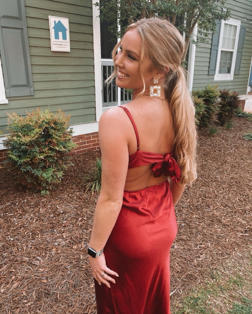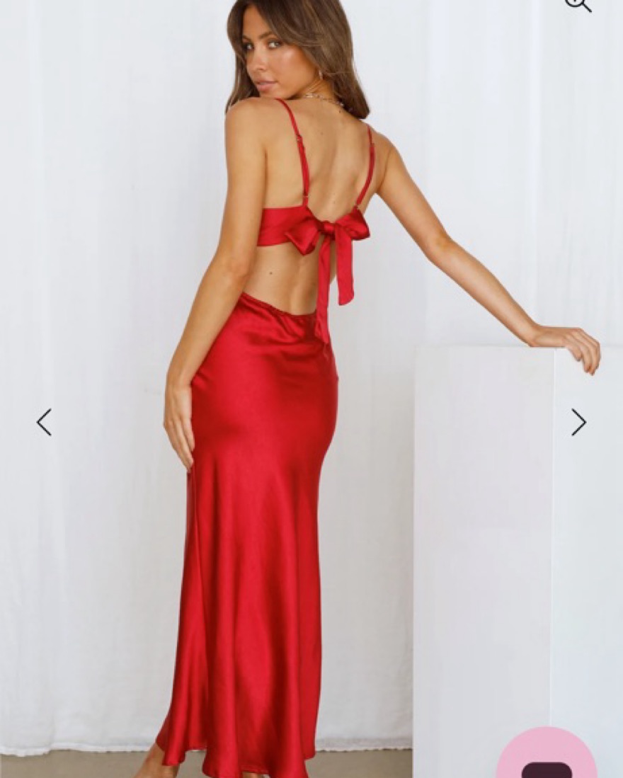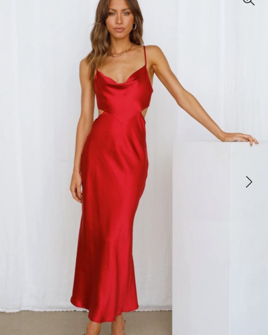 This elegant red satin dress is perfect for a formal event or night out on the town. The sleek, fitted silhouette and deep V-neckline create a sophisticated and alluring look.