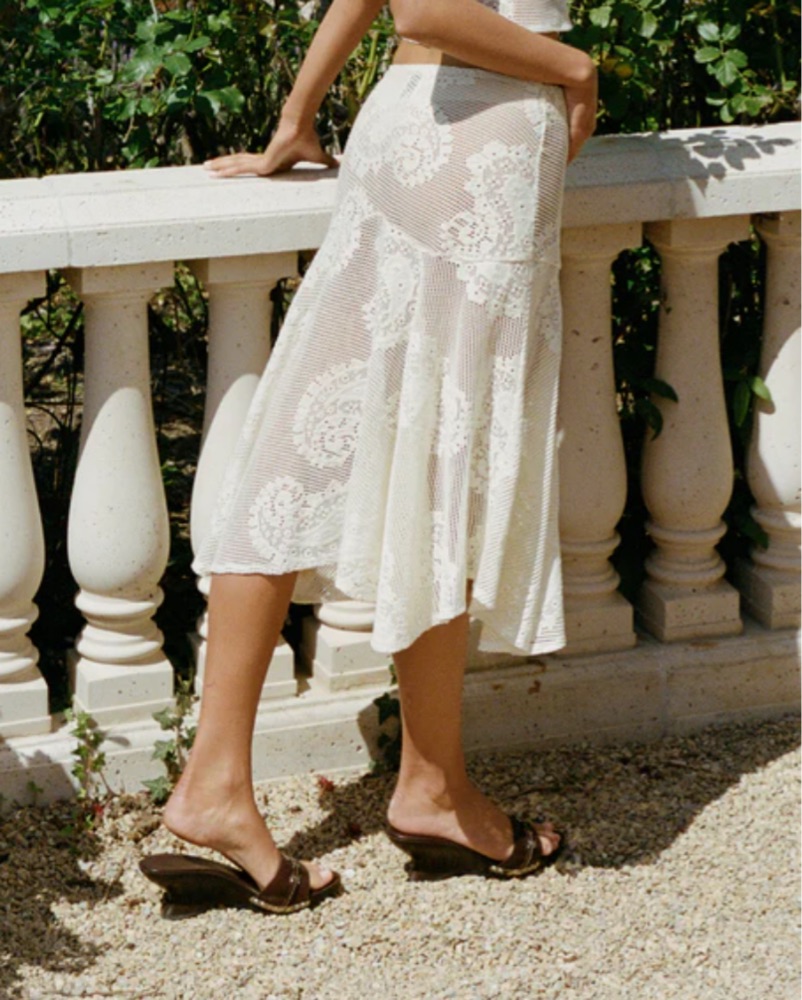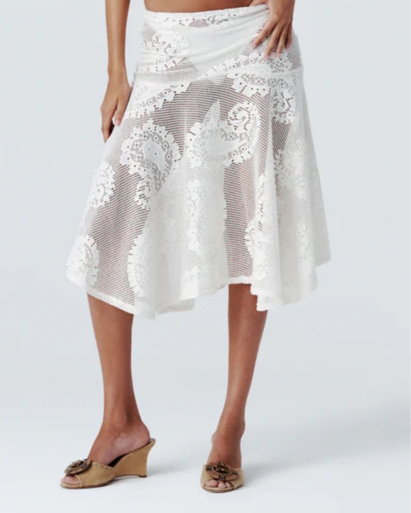 This stunning crochet lace midi skirt is a perfect cover up. The intricate floral pattern and flowing silhouette create a beautiful, romantic look.
