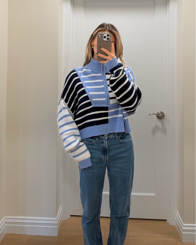 This cozy yet stylish striped knit sweater is perfect for a casual weekend brunch or day out shopping with friends.