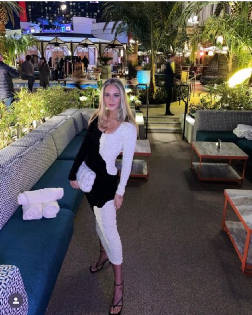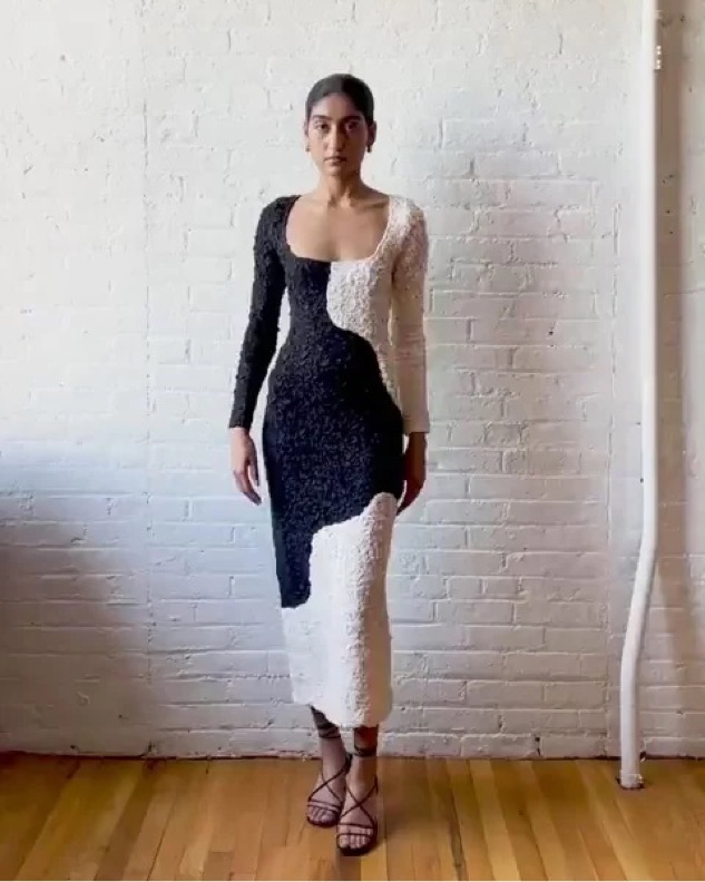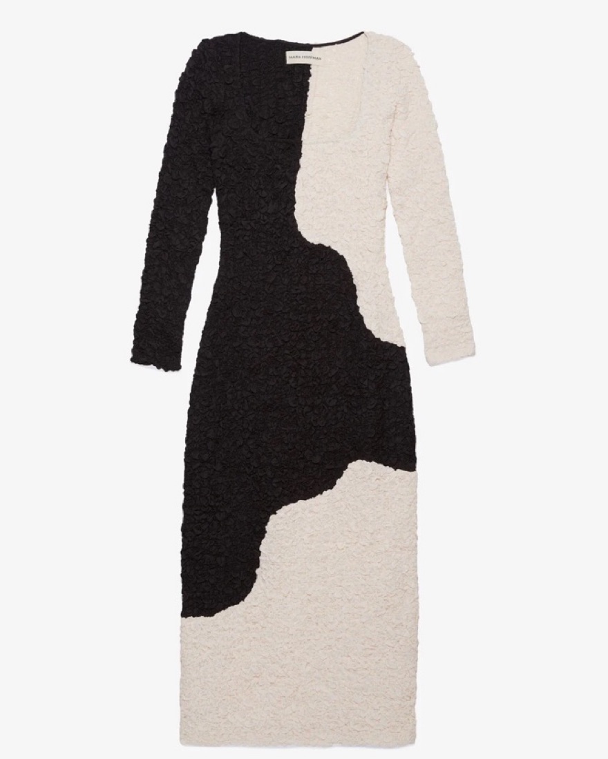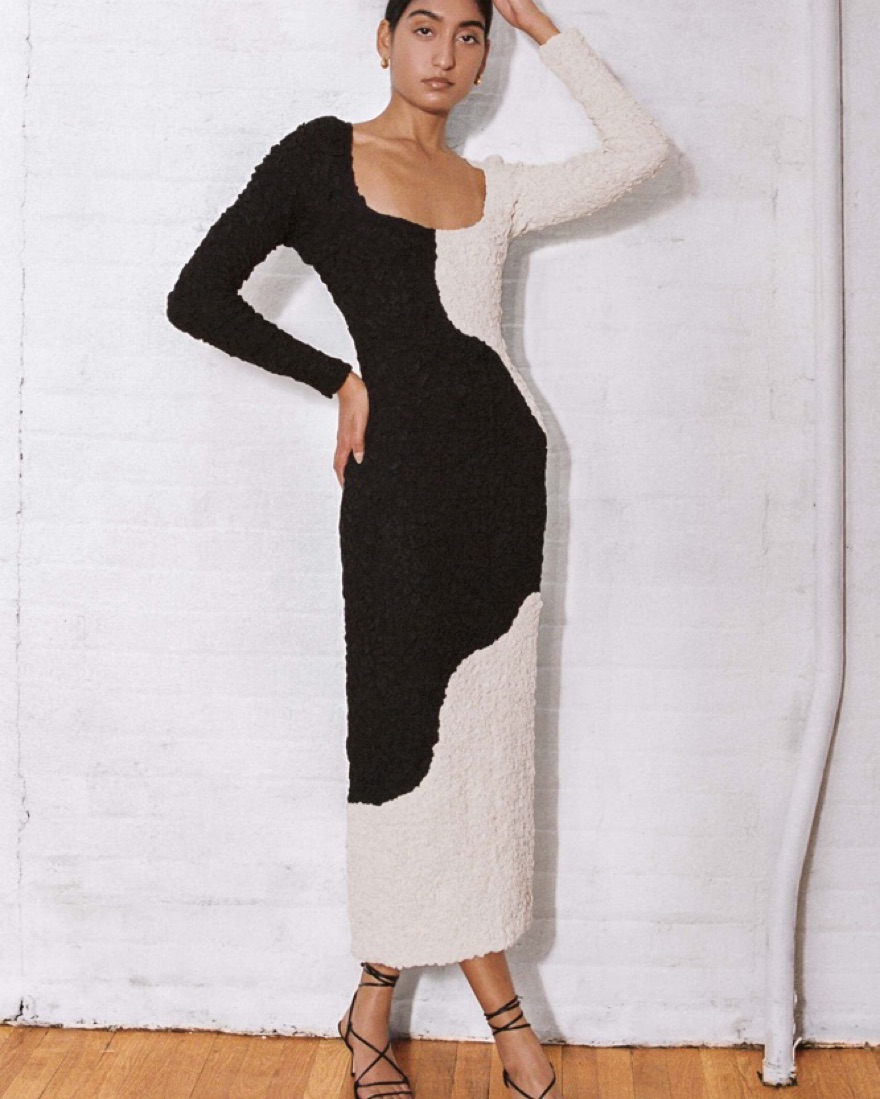 Amy is a stretchy bodycon dress with a square neck and long set-in sleeves, cropped at mid-calf. The dress is unlined and features a graphic, black-and-white colorblock print with a raised, textural popcorn finish.