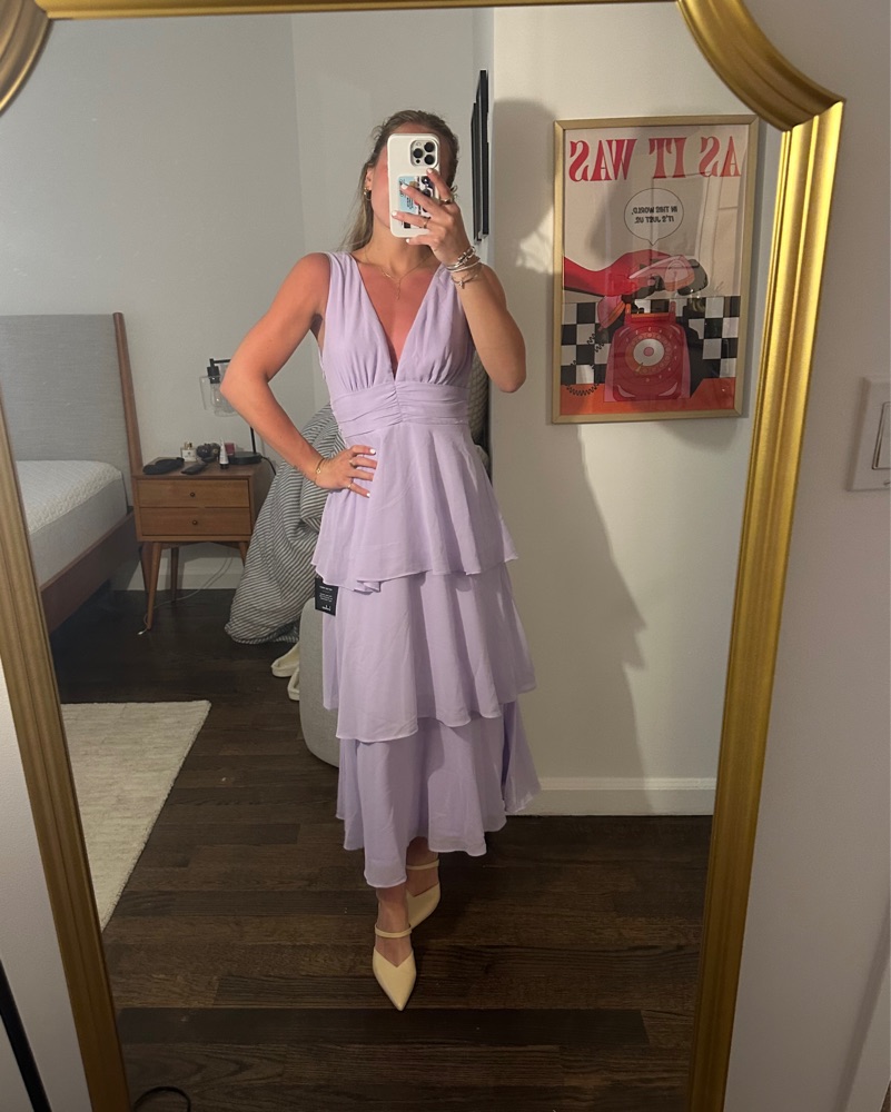 Gorgeous, flattering lavender dress. Compatible with most cup sizes. Fabric has no stretch. Fitted above waist and loose below waist.
