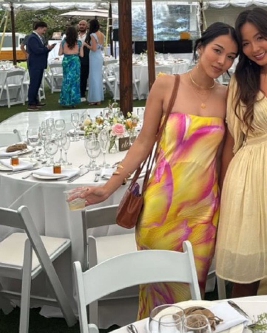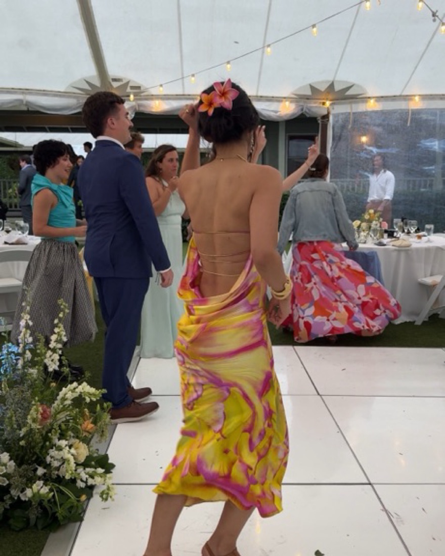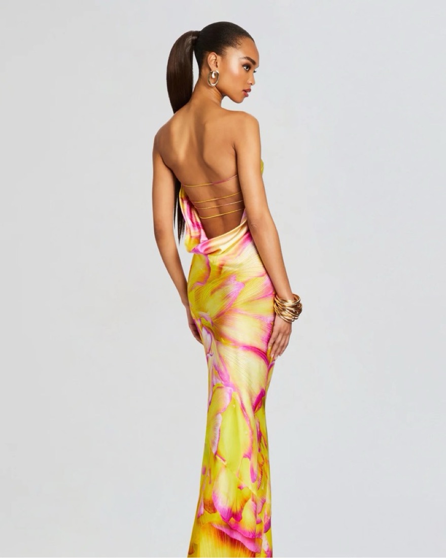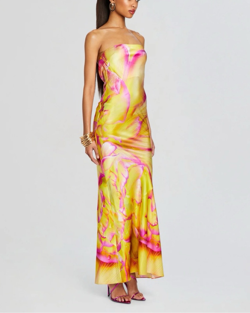 Low-back with thin straps across. Strapless 100% silk dress. Yellow and pink large flower design. Perfect for a summer or tropical wedding!! This has been hemmed a few inches to hit at the top of the foot for a 5’5” person.