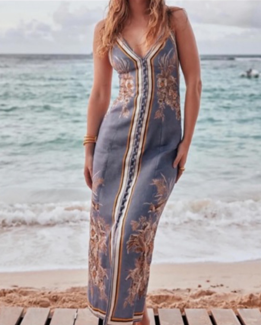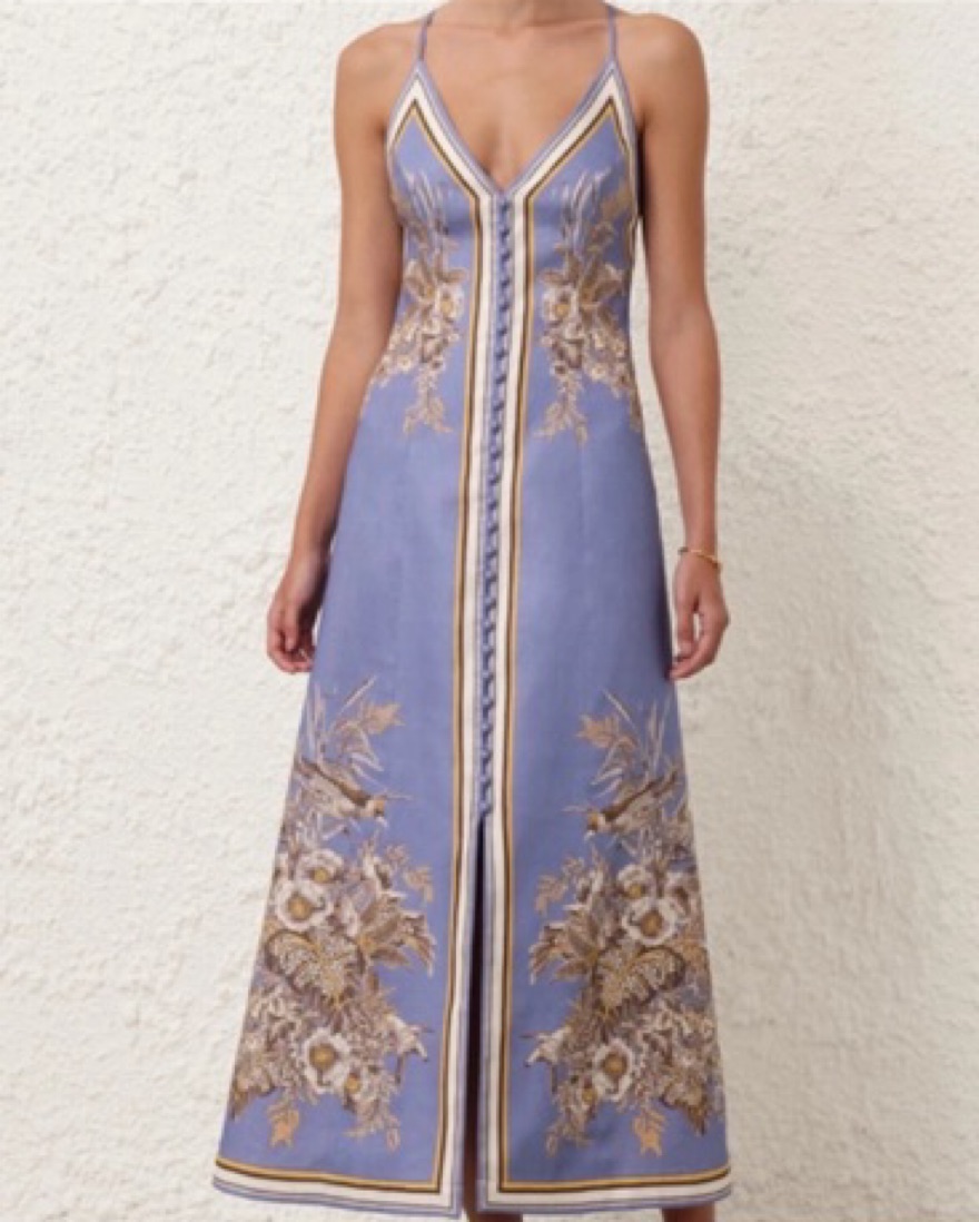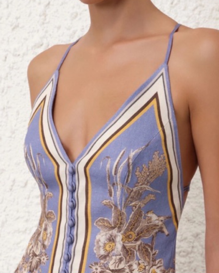 The Ottie Slip Dress in Blue Floral from Zimmermann's Summer Swim 2024 Collection is a linen slip dress featuring a placement print and buttons down the centre front.