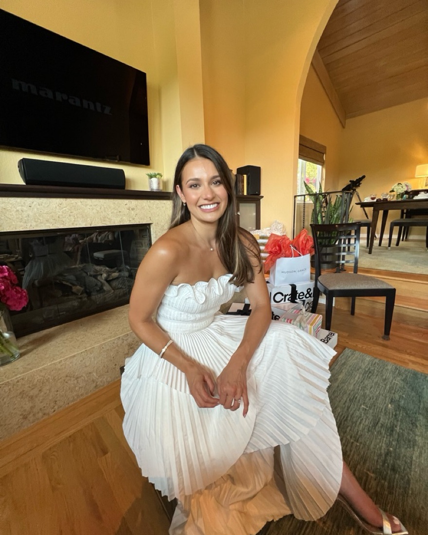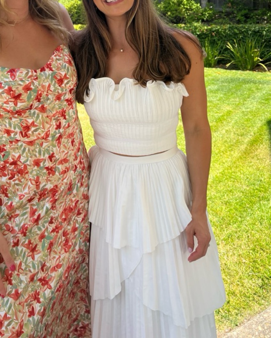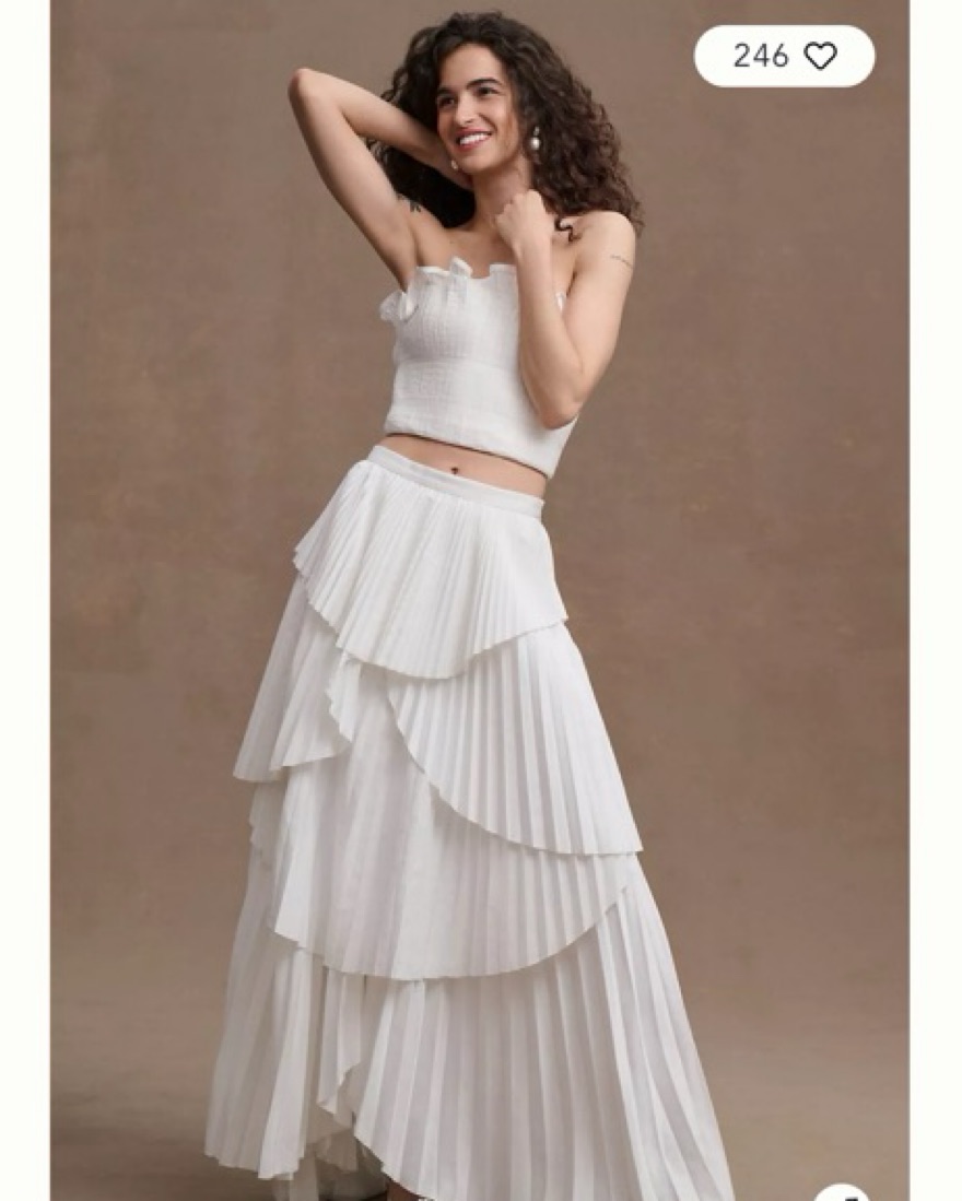 Curved tiers of pleated taffeta layers waterfall from a fitted waistband, creating dynamic movement that catches the eye. Two piece set fits size 2-4 and 32/34 C/D