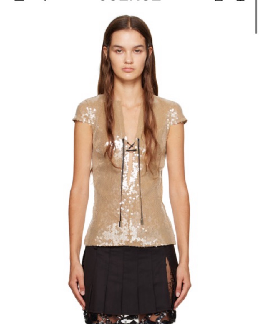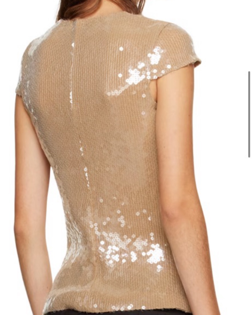 Sequinned stretch nylon mesh cap sleeve top. Would fit a 4/6