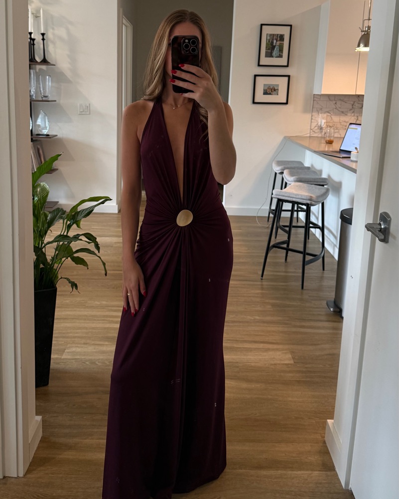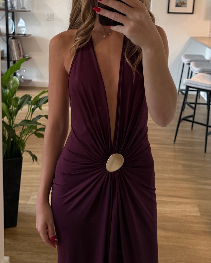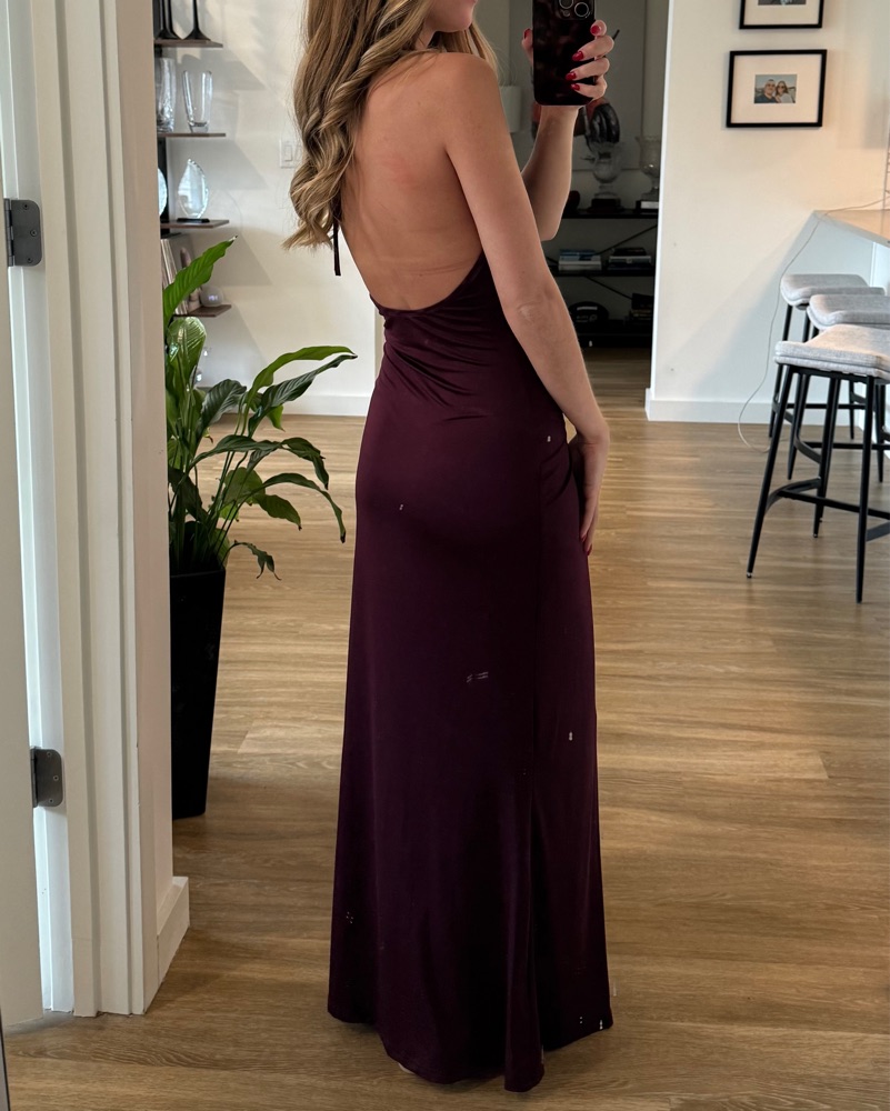 Silvia Tcherassi Aiko look- alike maxi dress in burgundy. Open back, halter tie neckline with gorgeous draping. 5’6” and 114 lbs.