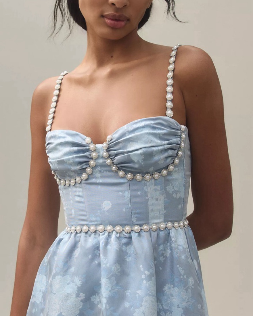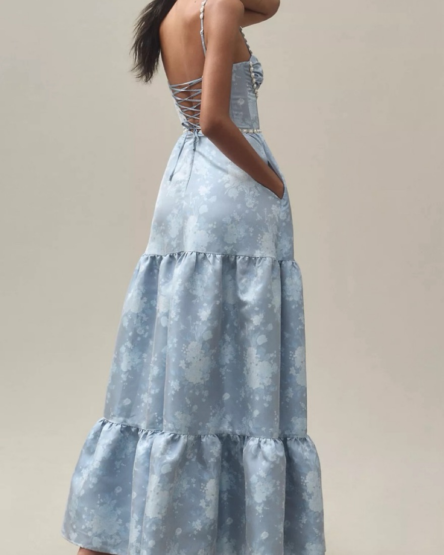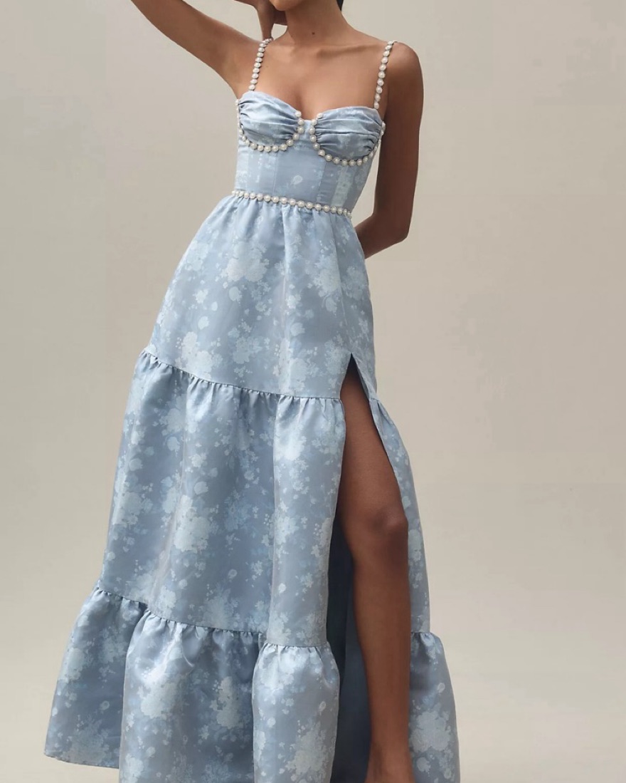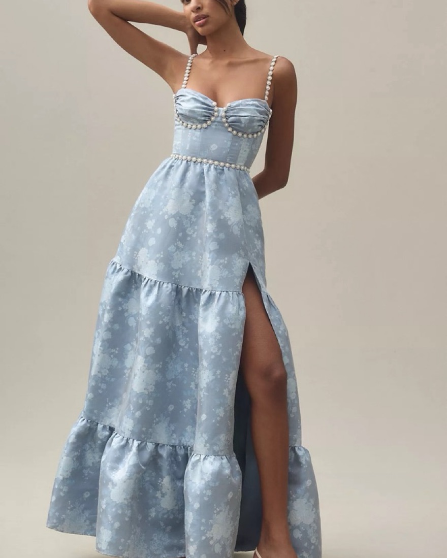 Elegant, sophisticated, and a timeless treasure, the V. Chapman Lucetta Dress is a dreamy corset gown featuring beautifully gathered cups, pearl and crystal trim, and gathered skirt tiers. Flaunting a side slit and side pockets, every twirl will entrance the crowd in this mesmerizing maxi!