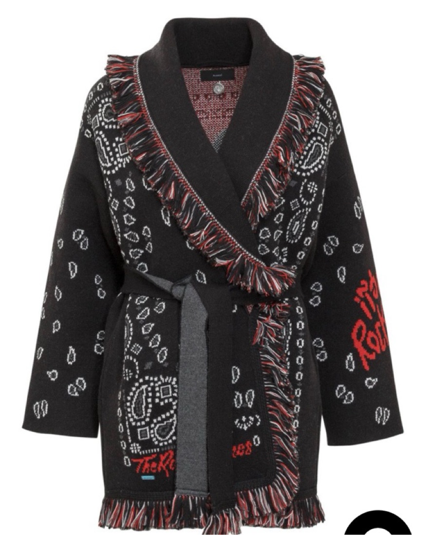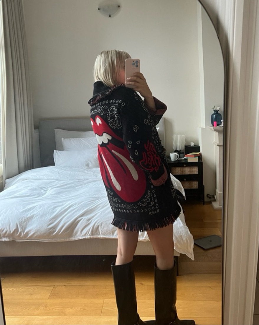 One of a kind piece; comes with a belt but not needed to wear! XS but oversized fit; also works as S. Super warm and get a million compliments on it. Statement piece.