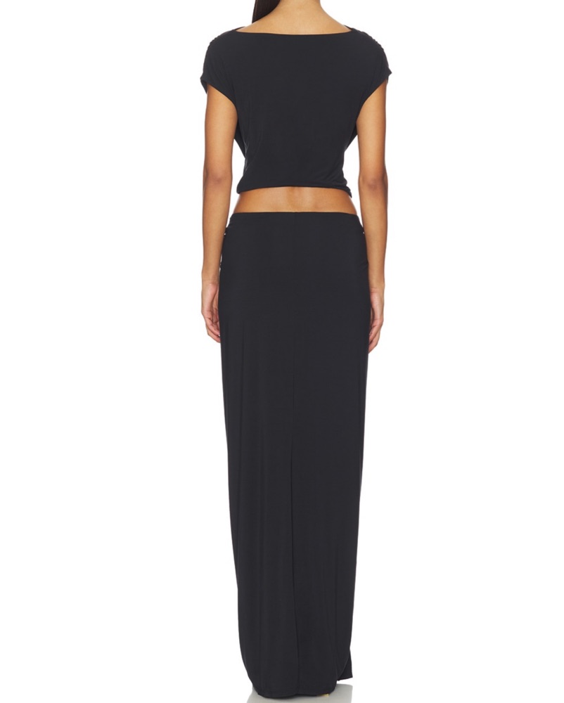 • 87% viscose, 13% elastane • Made in China • Hand wash • Fully lined • Pull on styling • Gold-tone ring hardware at front with attached draped detail