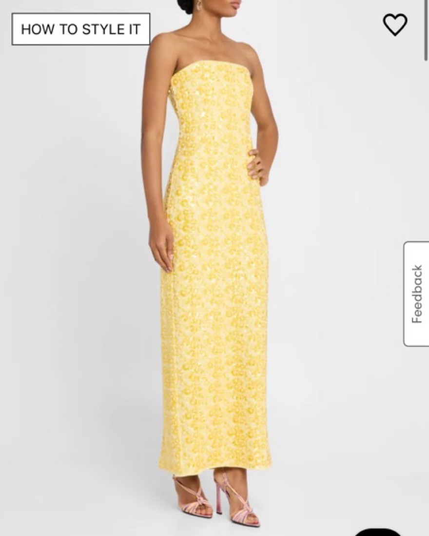 This strapless floral maxi dress is perfect for a wedding. The bright yellow hue and fun floral print create a cheerful, feminine look.