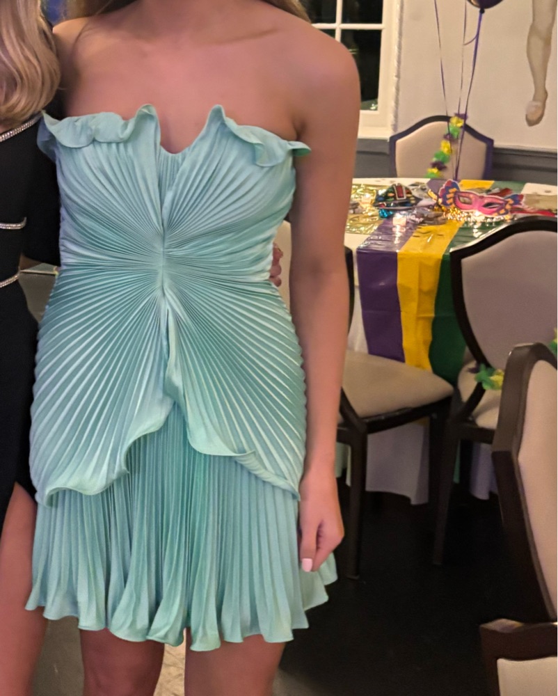 This stunning pleated mint dress is perfect for special occasions or a night out. The elegant design and vibrant color will make you feel confident and stylish. Worn once!