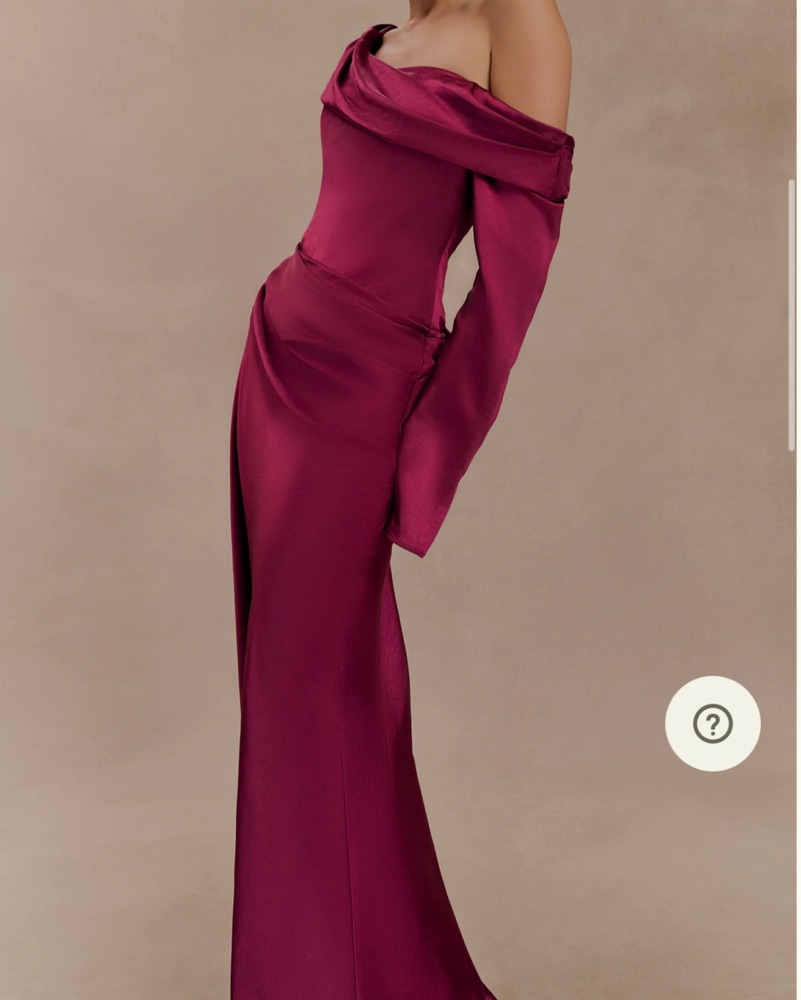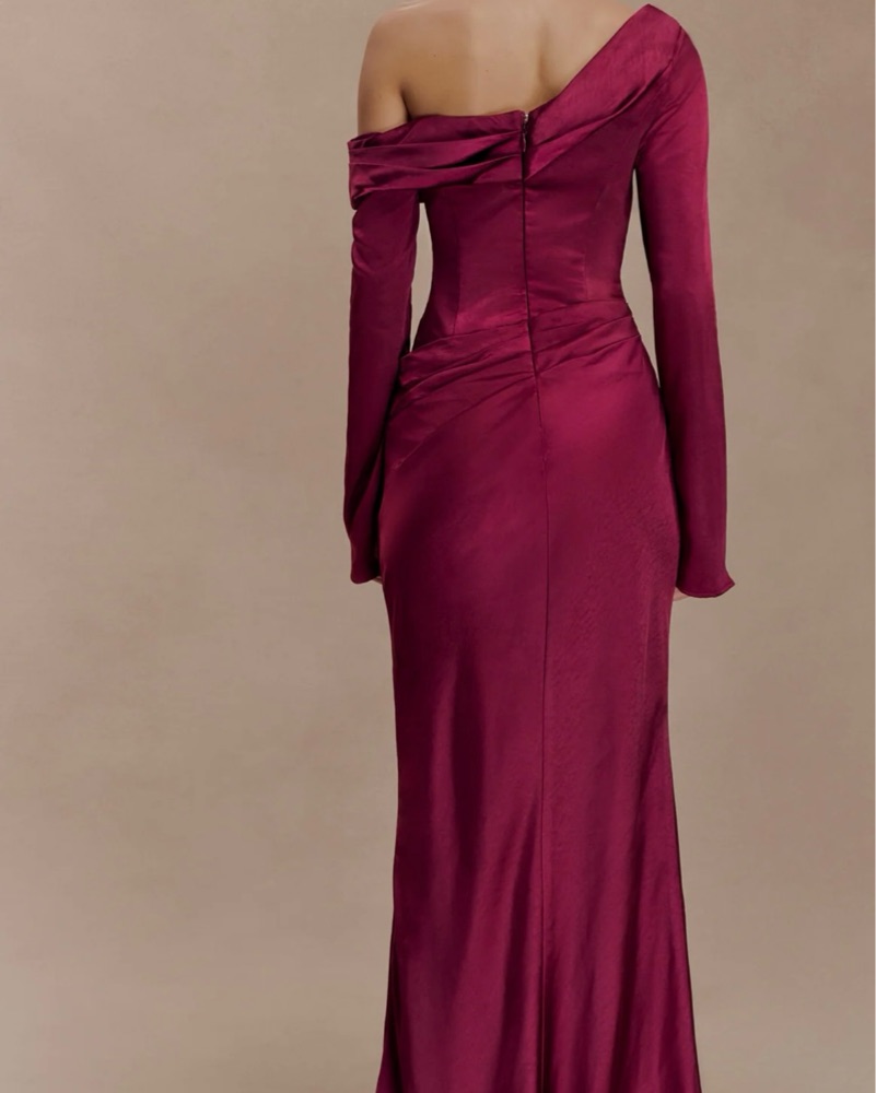 Never been worn, size M but was recommended to size up for a more relaxed fit. Available for sale or rental! Asymmetrical neckline, Long sleeve, Gathered bust overlay, Fitted bodice, Boned bodice, Gathered hip detail, Internal elastic waist stay, Back zip & hook & eye, Maxi length