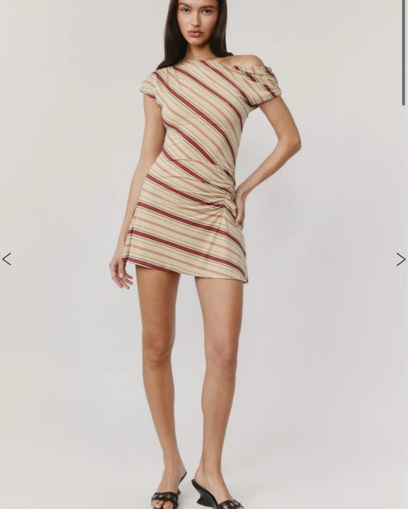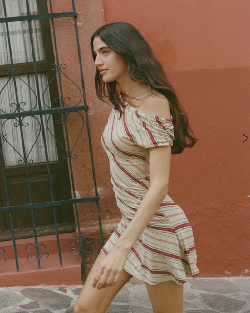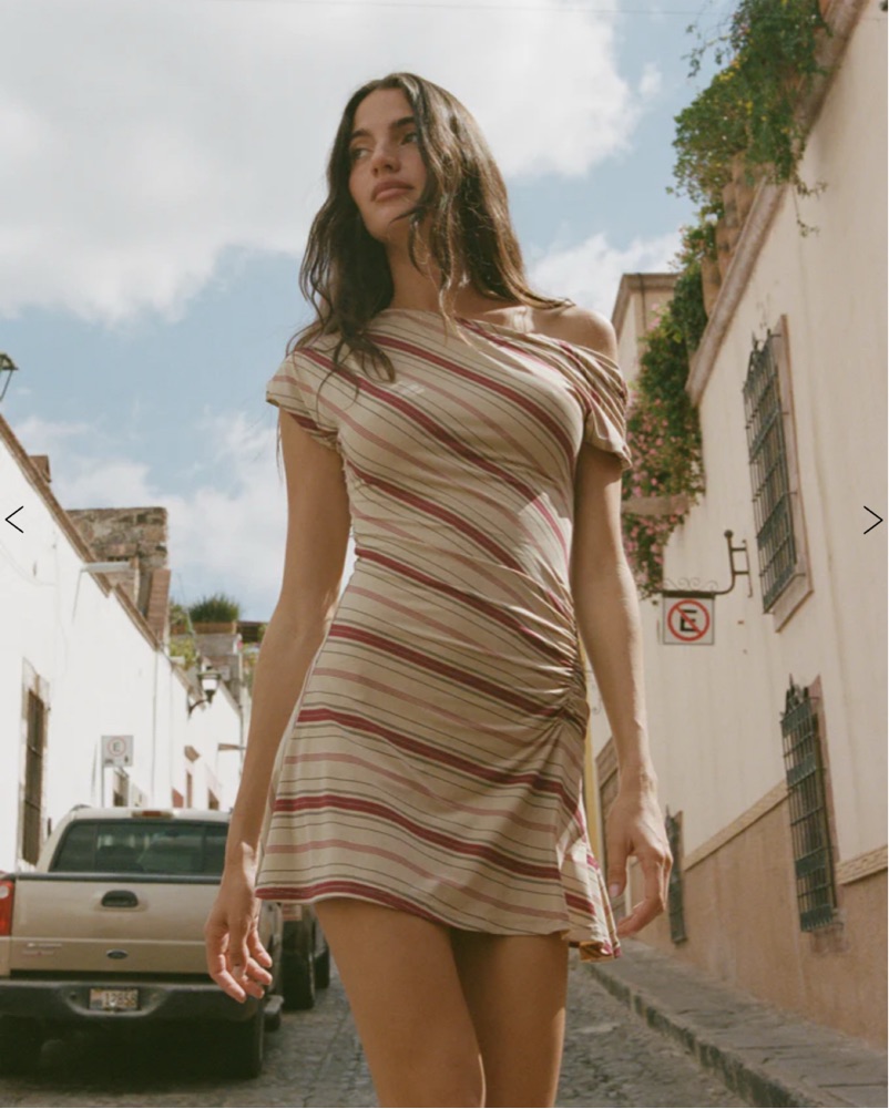 The Camilia Dress is an off-the-shoulder mini dress with a flowy fit and side ruching details.