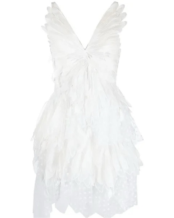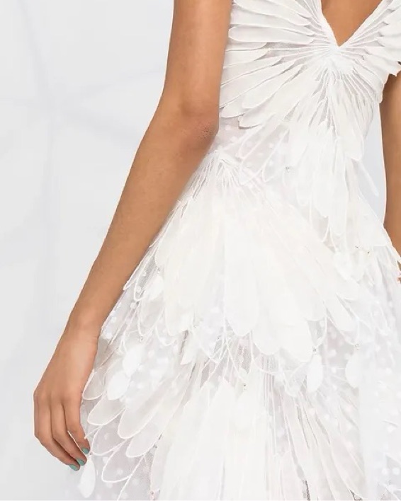 Size AU2/US6-8. Designed with a flocked handkerchief hemline, the 'Rhythmic' minidress is intricately designed from linen-silk into an appliqued design made of layers of white tulle with flared details, faux-pearl embellishment and an asymmetric hem.