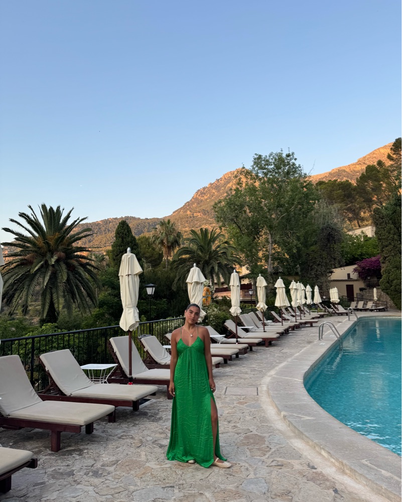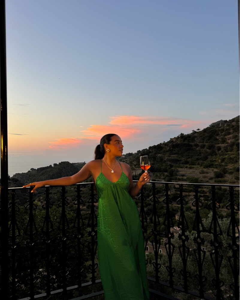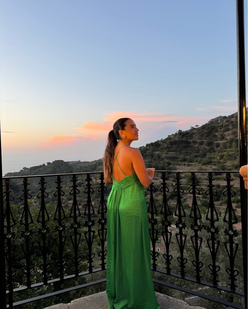 Lightweight maxi dress in a saturated emerald green. Features thin adjustable straps, a gathered bust seam, and a breezy, flowy fit through the body. The fabric has a scrunched texture in the bust area. High side slit adds movement and a subtle shape to the silhouette. Unlined with no zipper