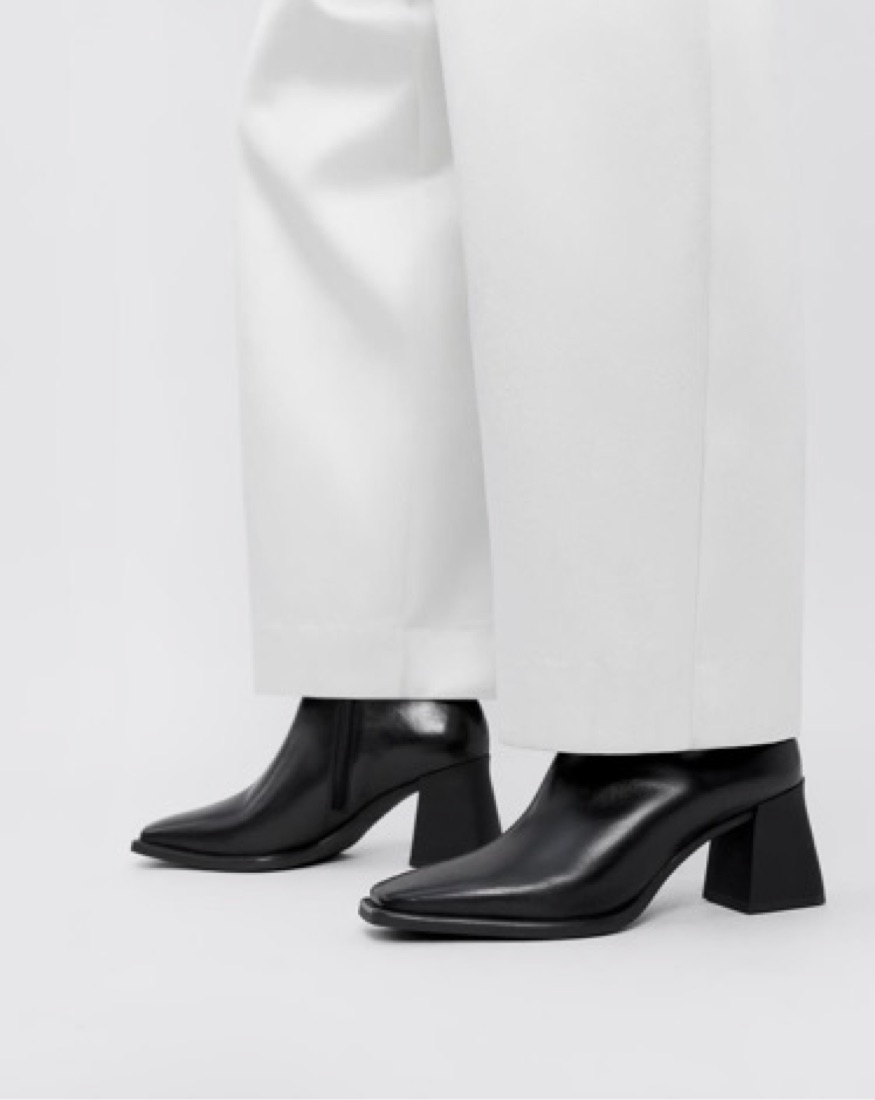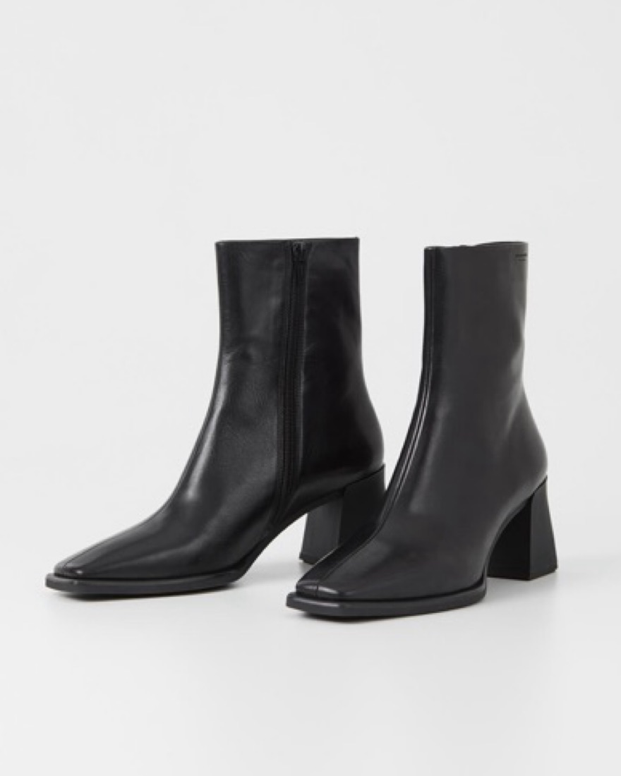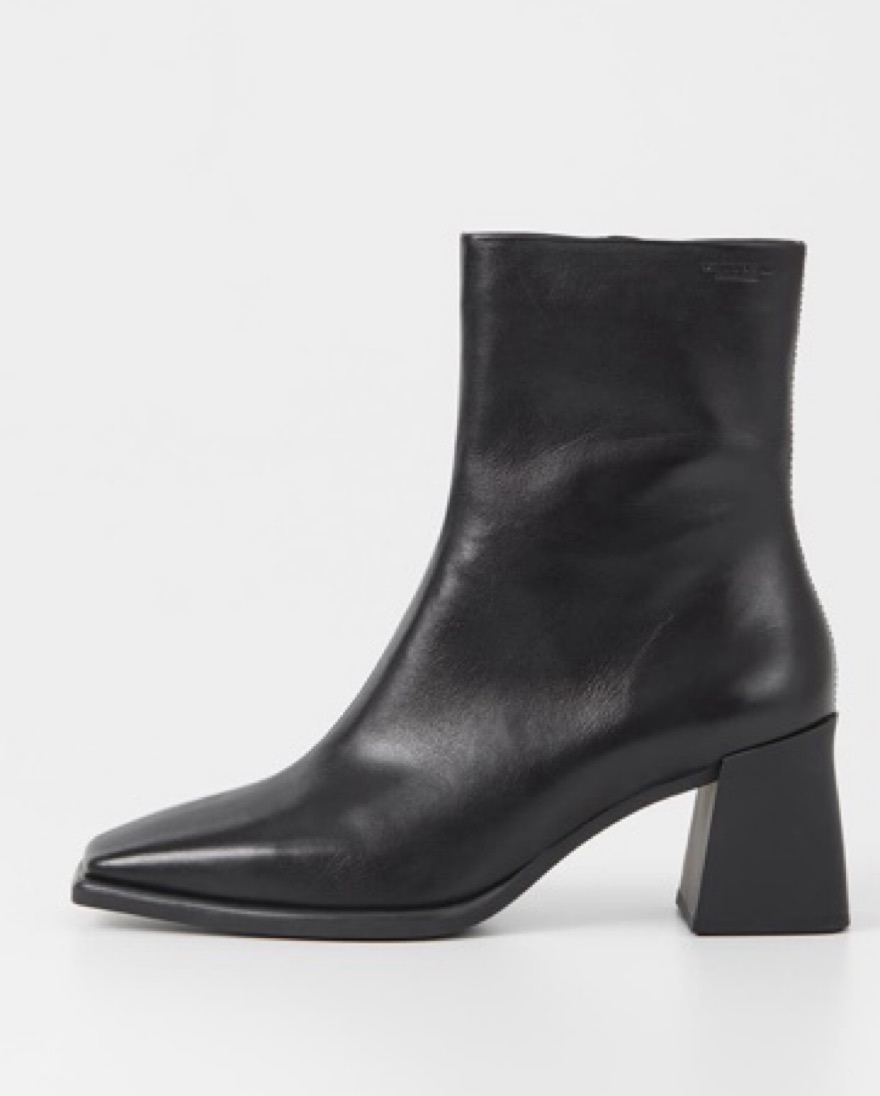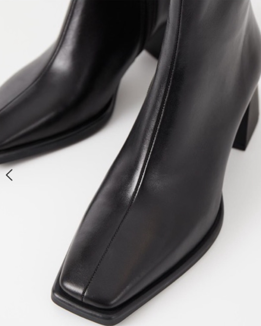 Black leather, mid-rise, square toes, inside zippers, 2.5in heel