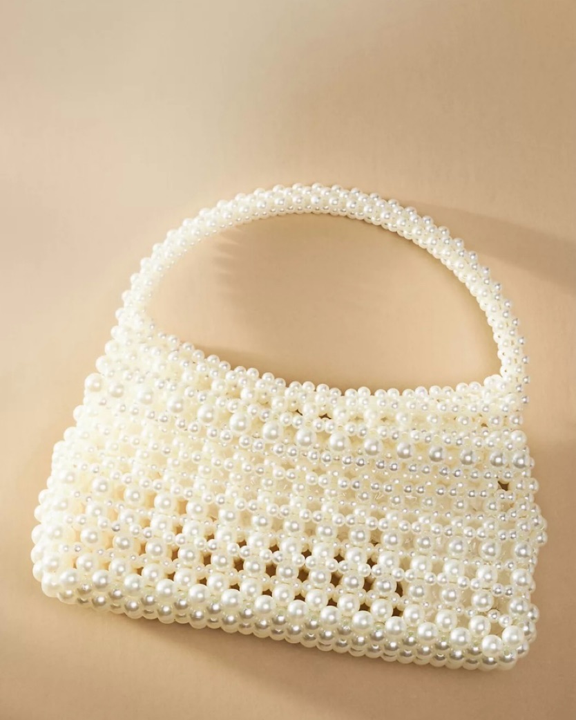 Sweet and sophisticated, the Dolce Vita Elloise Pearl Handbag features a top handle and a removable crossbody chain, effortlessly keeping all your bridal essentials close by.