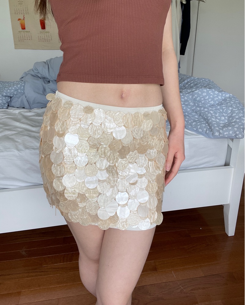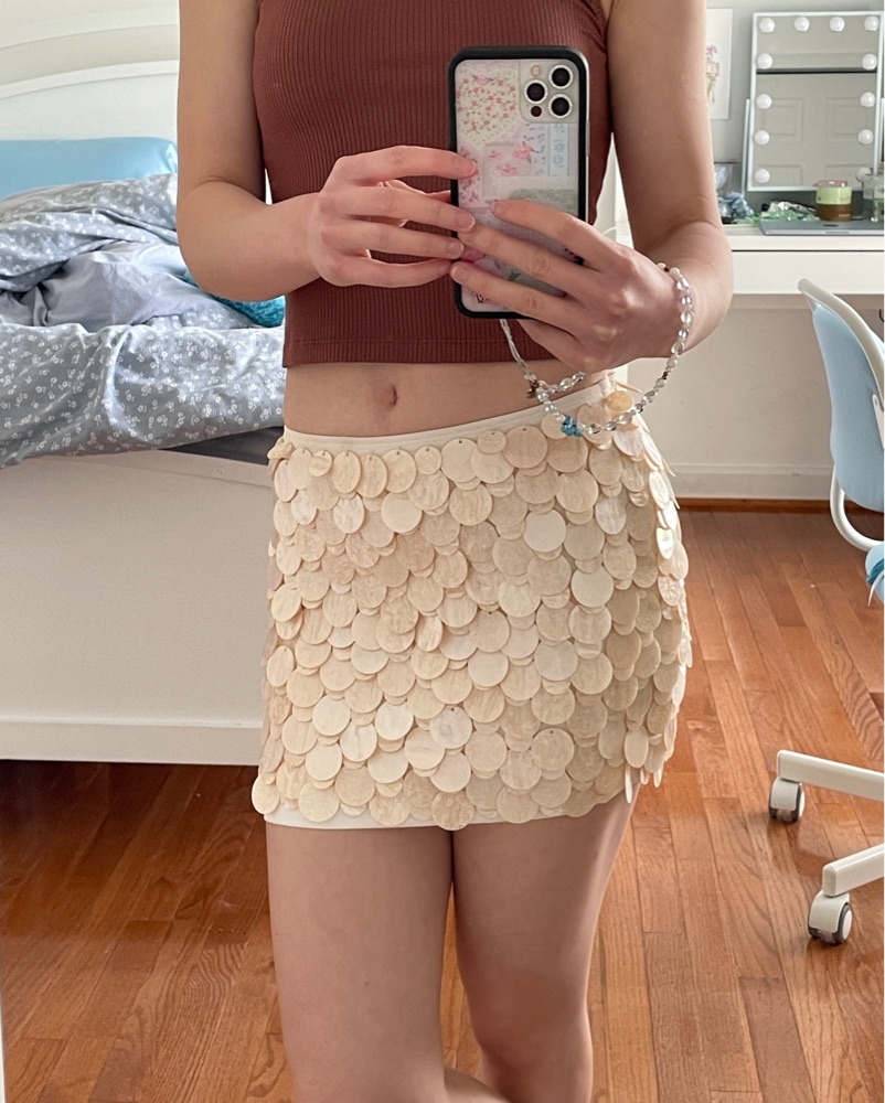 still like new, very delicate so please take care of her!!! NOT ideal for sitting on hard surfaces since there are shells on the back, please keep that in mind so you don't damage the beads. runs slightly large, i usually wear size 2 but this fits snug on me.