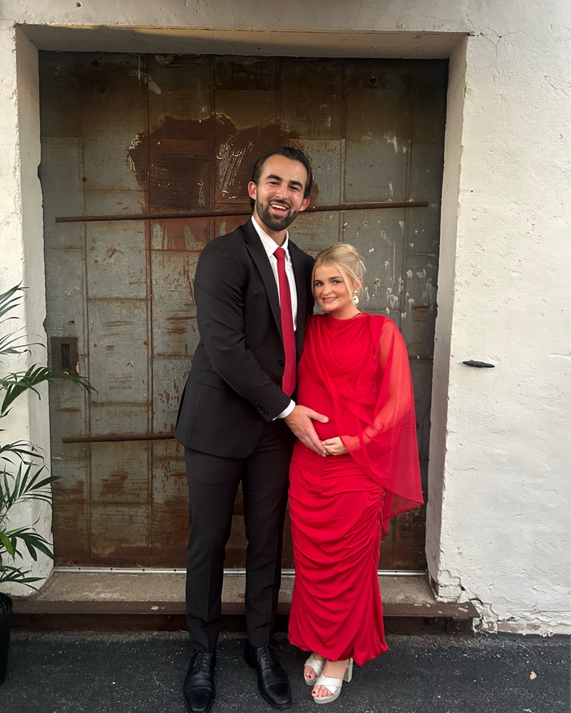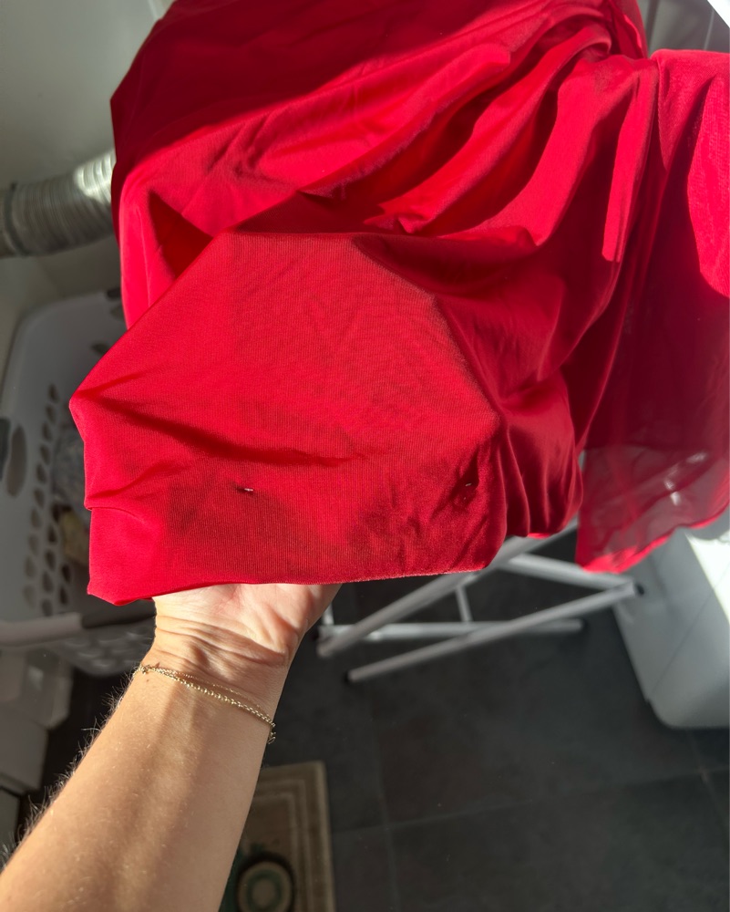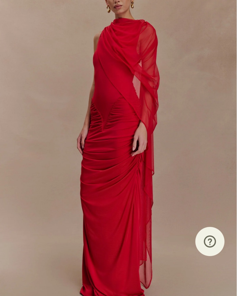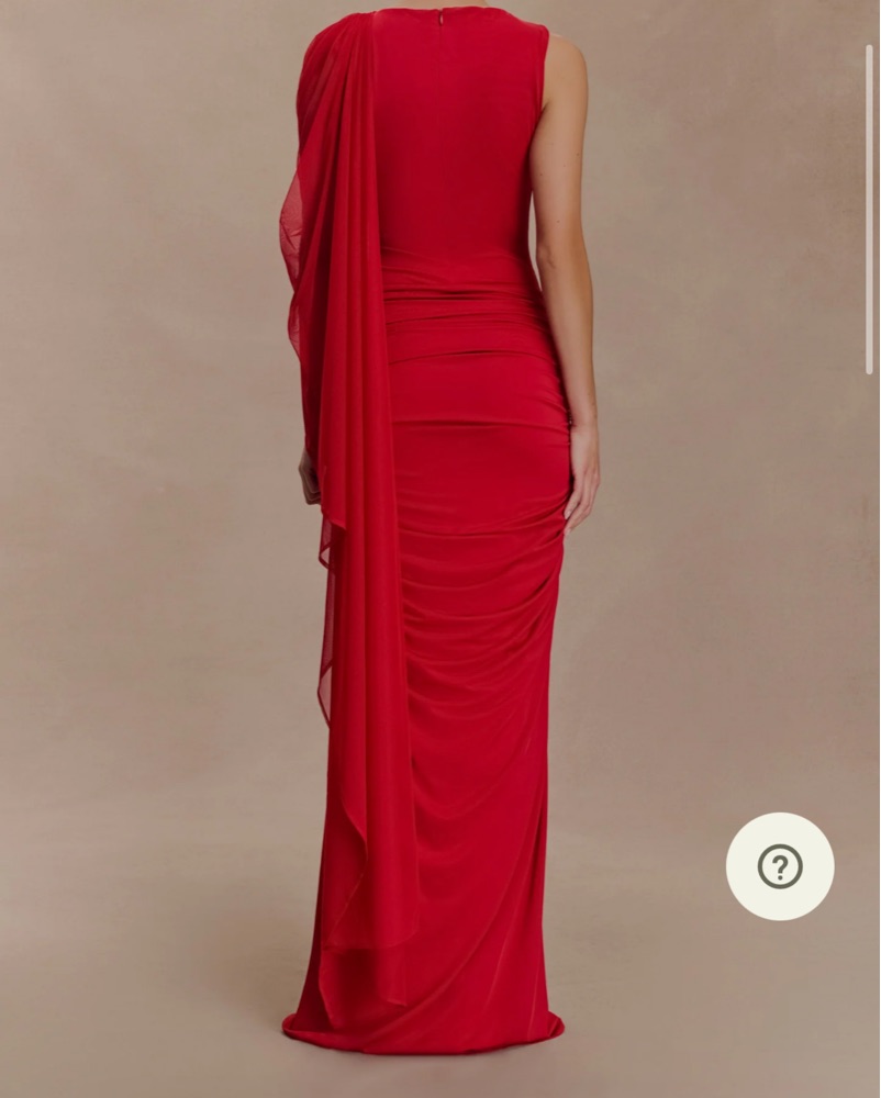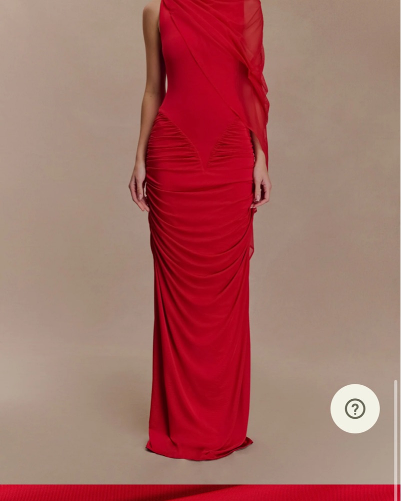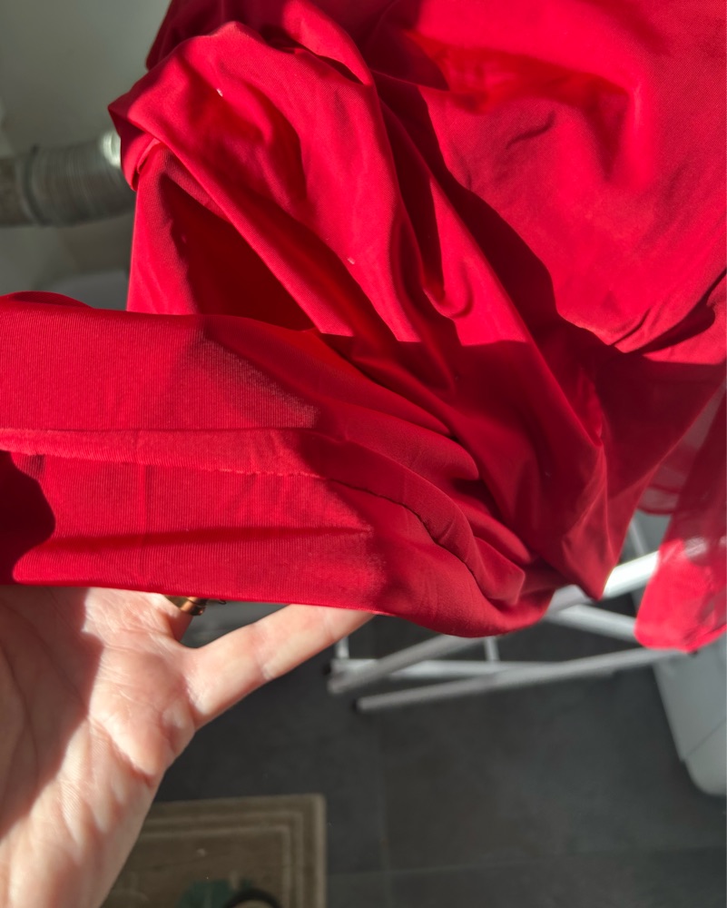 Amandine - Ruched Slinky Maxi Dress - Ruby - size medium, stretchy, drop waist. NOTE: this has been DIY cut & hemmed for me who is 5’, photos of the hem included. You really can’t tell once it’s on.