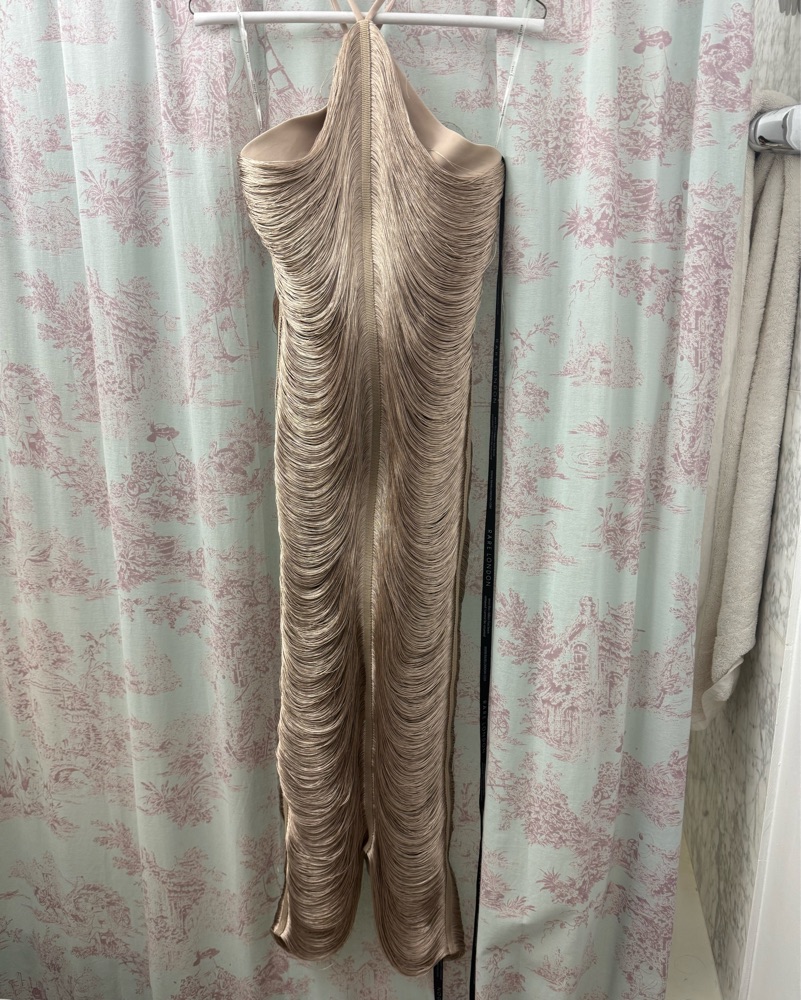 Gold Fringe Halter Maxi Dress — dupe of Cult Gaia ✨ US Size 2 fits like XS. The back looks just like the front of the dress rather than an open back. Fabulous statement! This is a super delicate dress, pls see up to date pics before renting 💕 I own two of these. Be gentle, damages apply!