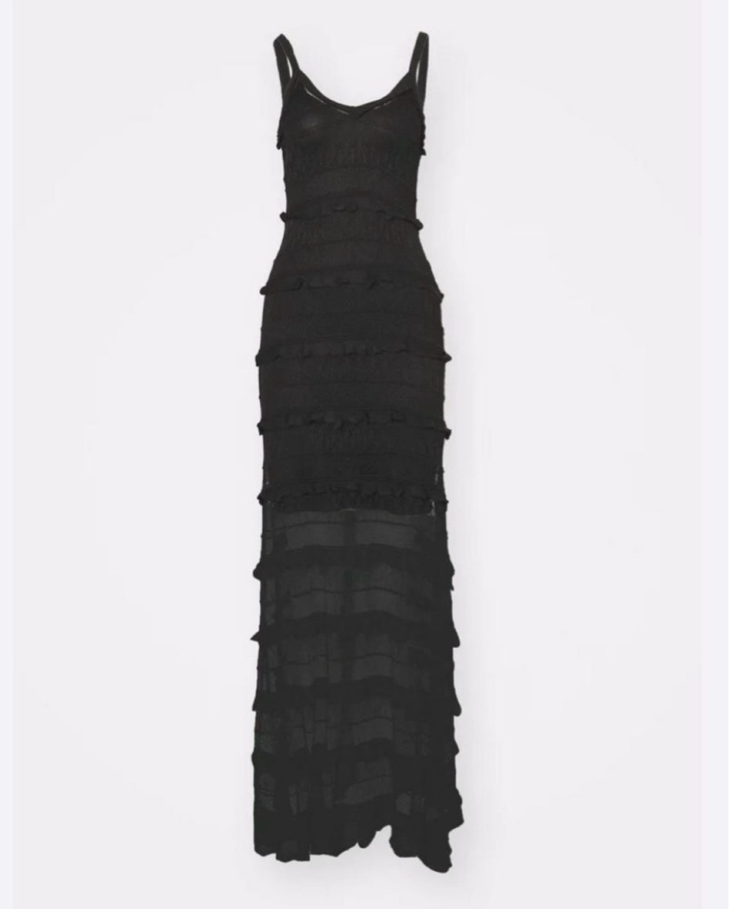 This stunning black maxi dress features delicate tiers and a sleek silhouette, perfect for a special occasion or formal event.Size 34