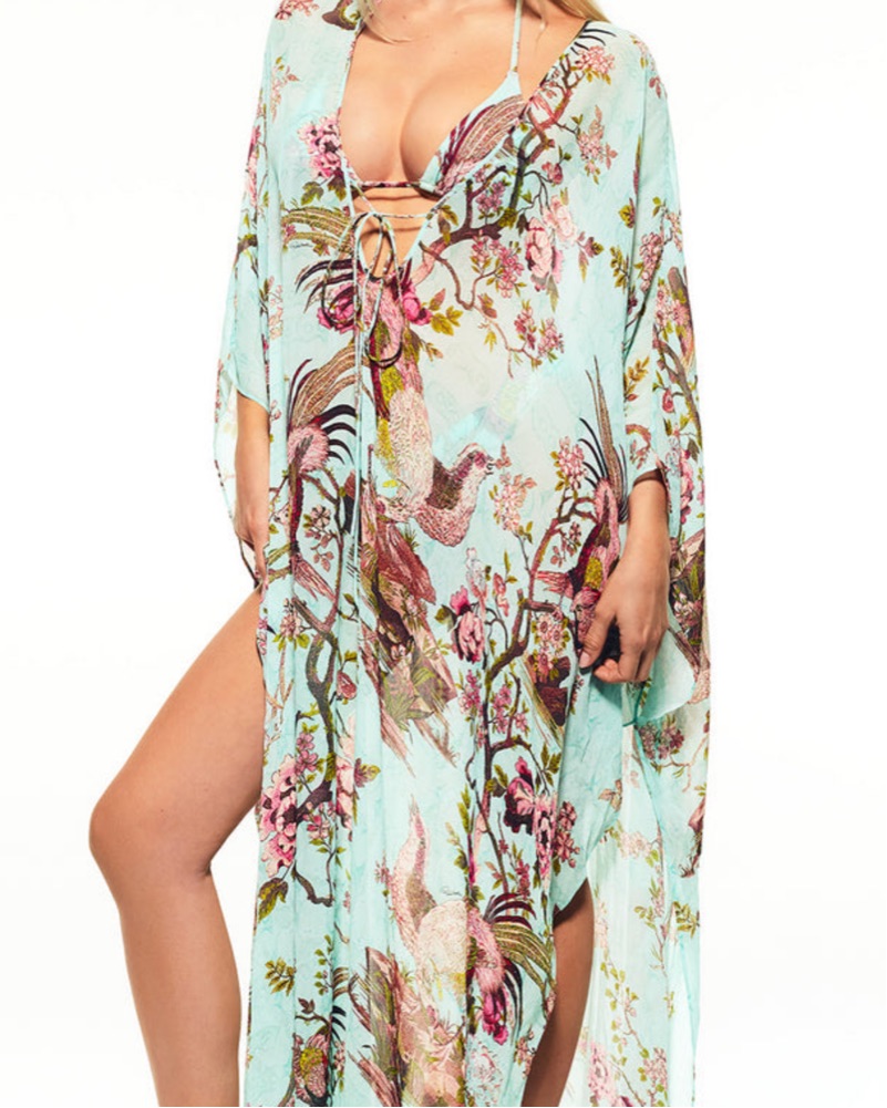 Size S full set - tie bikini top and bottom and kaftan!!! Since it’s a tie top, it can fit S-M. Kaftan can also fit S/M. Perfect set for euro summer or hamptons!!