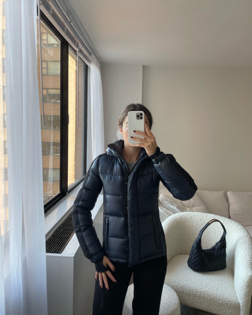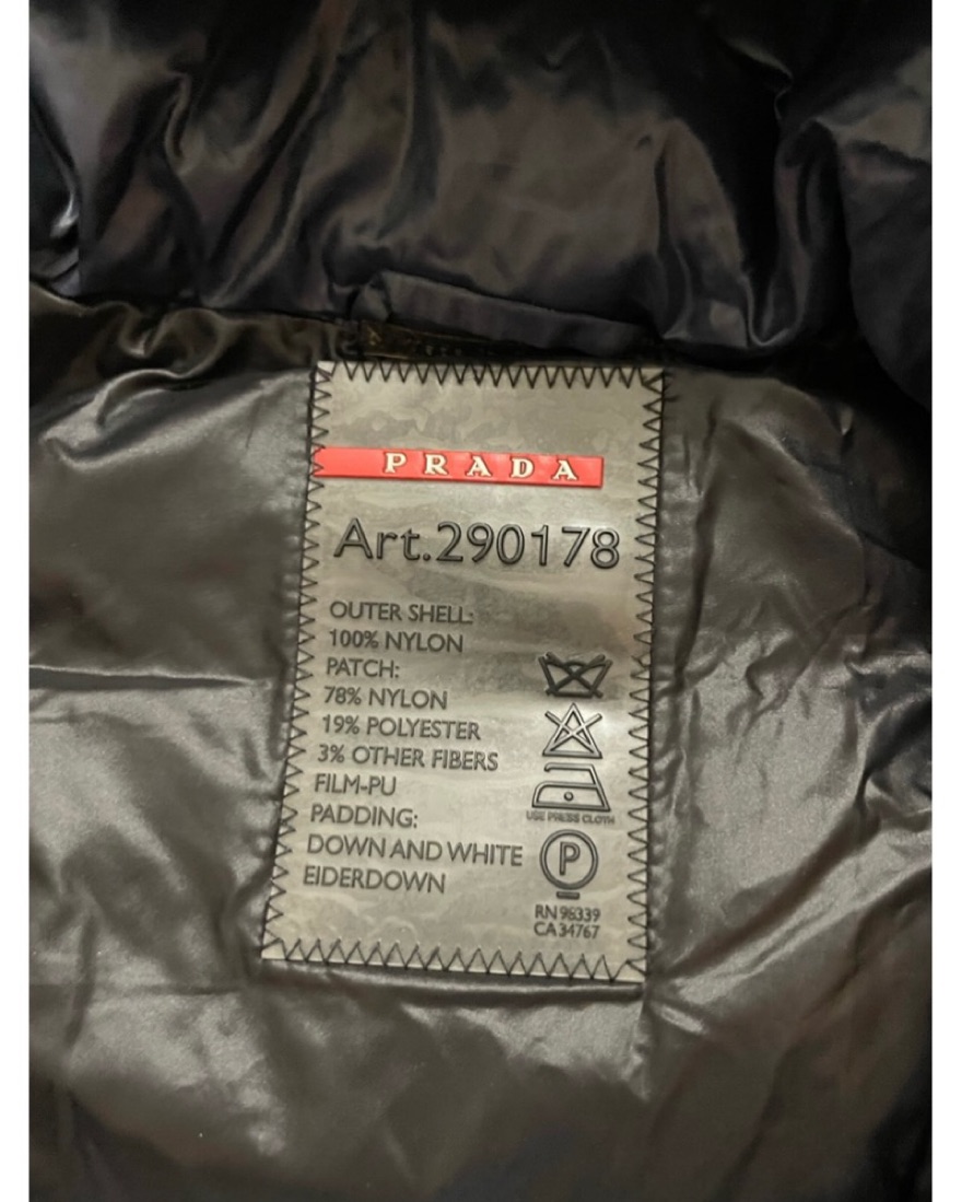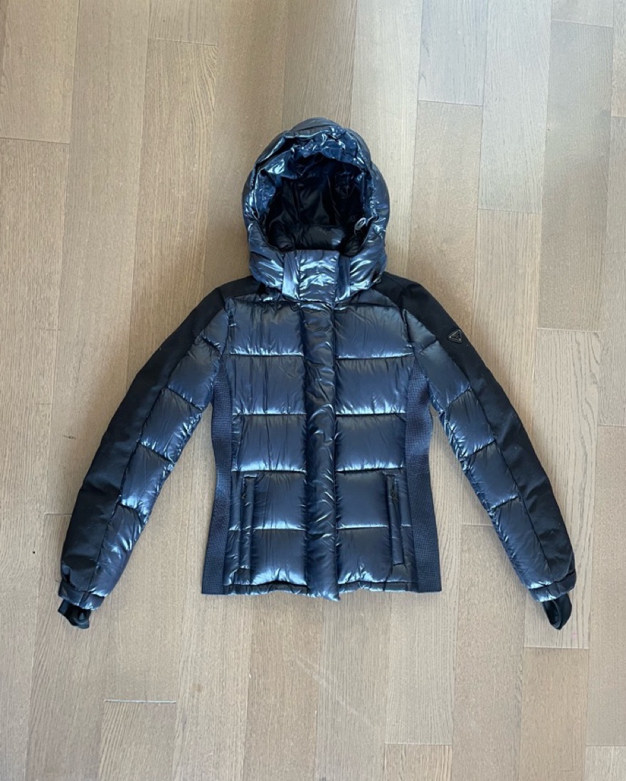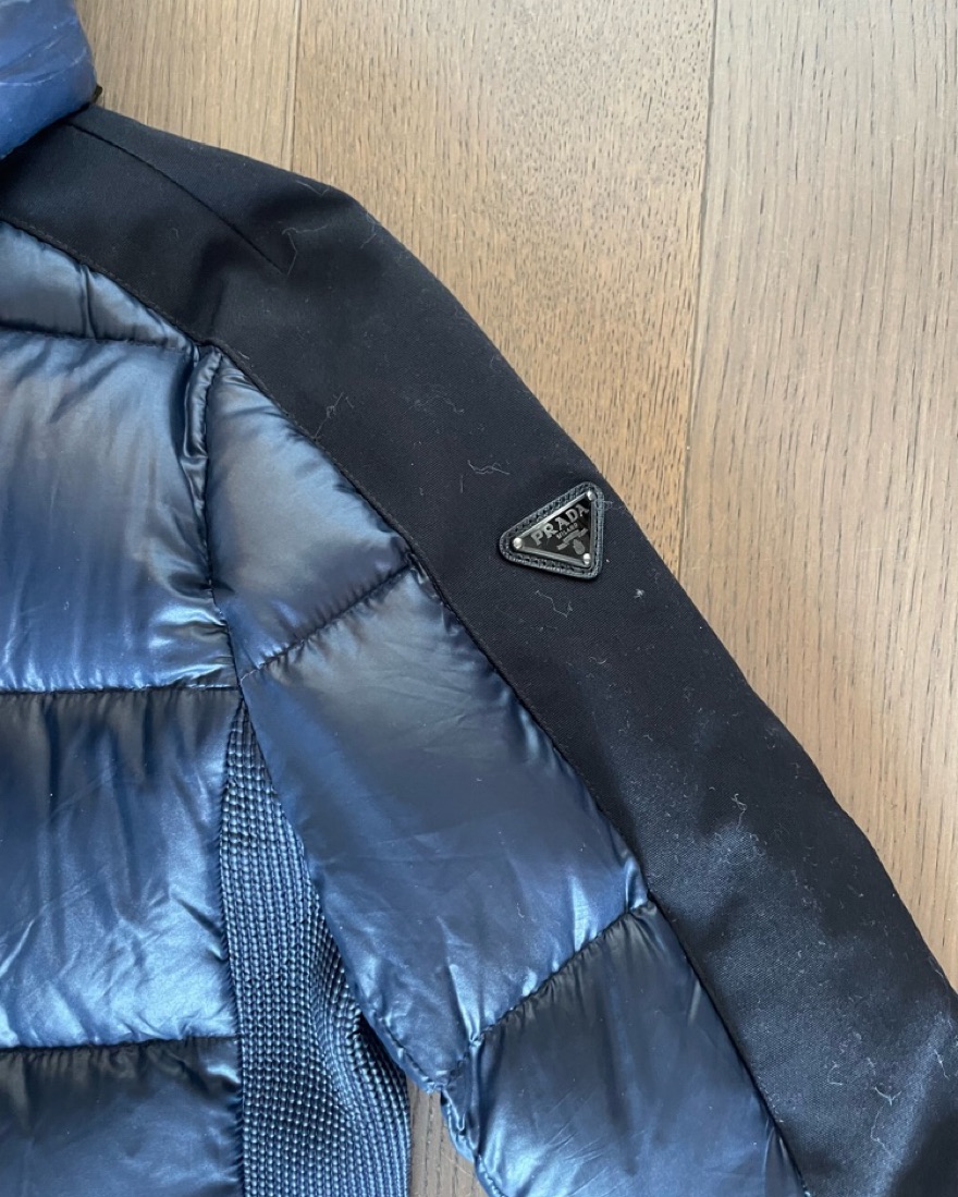 Renting my navy Prada puffer jacket in a size 40 fits like an XS - it has black sleeve details and the body of the jacket is navy perfect winter coat. Belt not included!