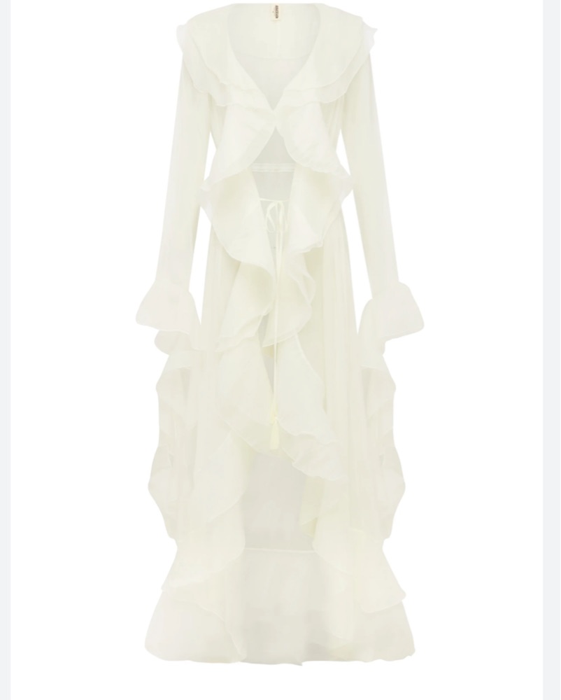 This stunning white ruffled cover up exudes sophistication and grace. Ideal for special occasions, beach parties in, or formal events.
