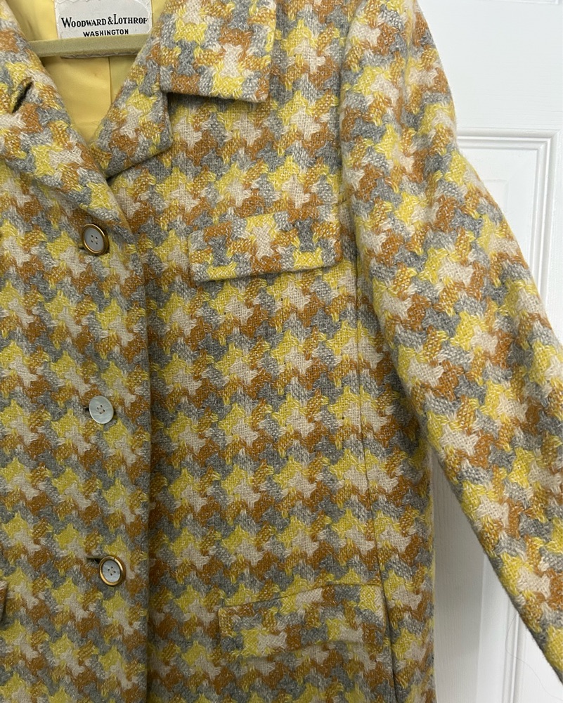 Gorgeous vintage yellow and brown houndstooth button down coat by Woodward & Lothrop Washington (the first department store in DC, founded in 1877!). Very 60s, very cool. Size not listed but it fits as an XS/S. Four buttons and one does not match. One of a kind find. Selling price negotiable.