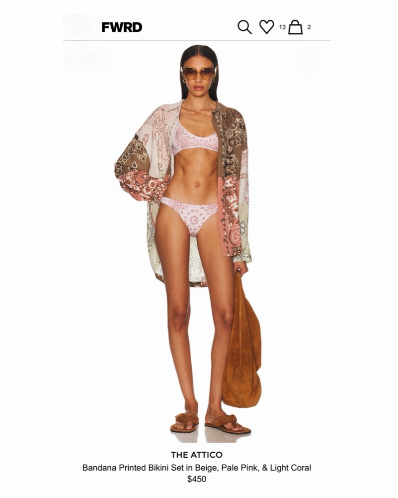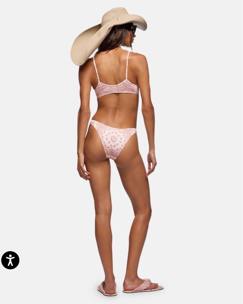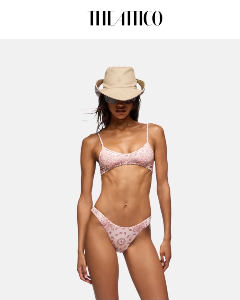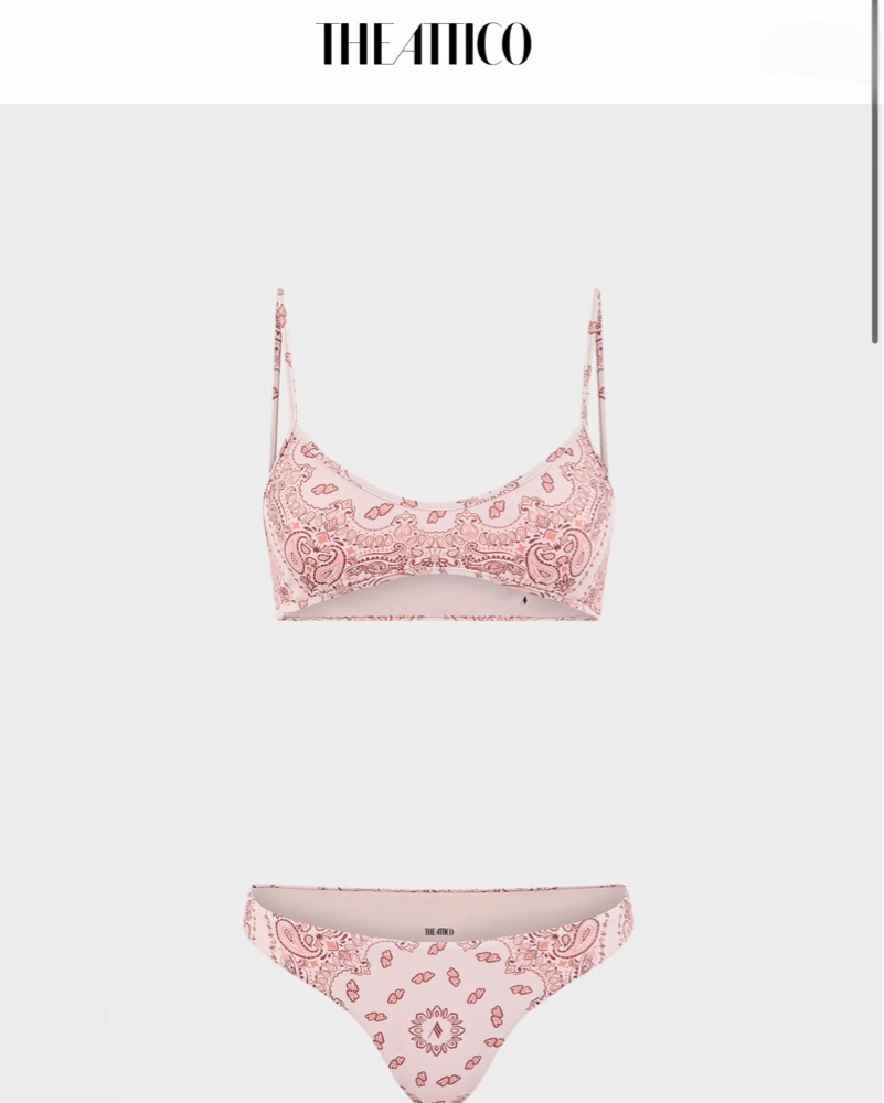 Pink bandana printed bikini set by The Attico. Beige, pale pink & light coral paisley color-way.
