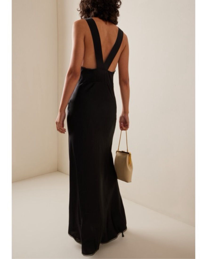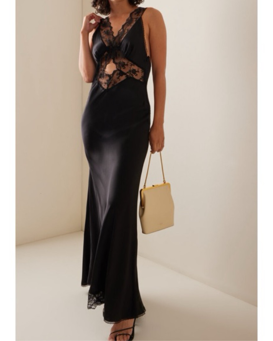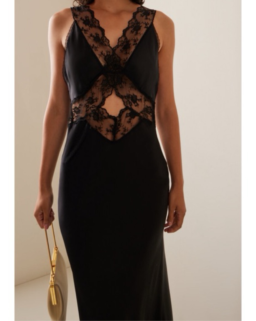 Slinky black maxi dress with beautiful lace detailing and a criss-cross back. 100% Silk.