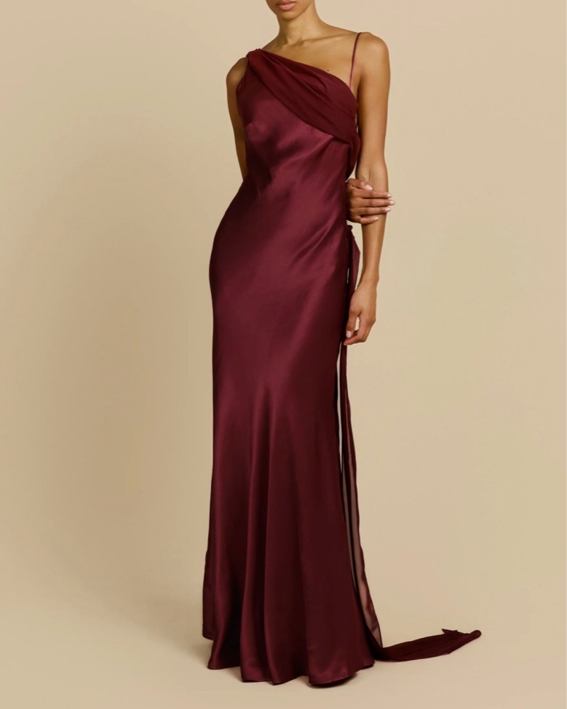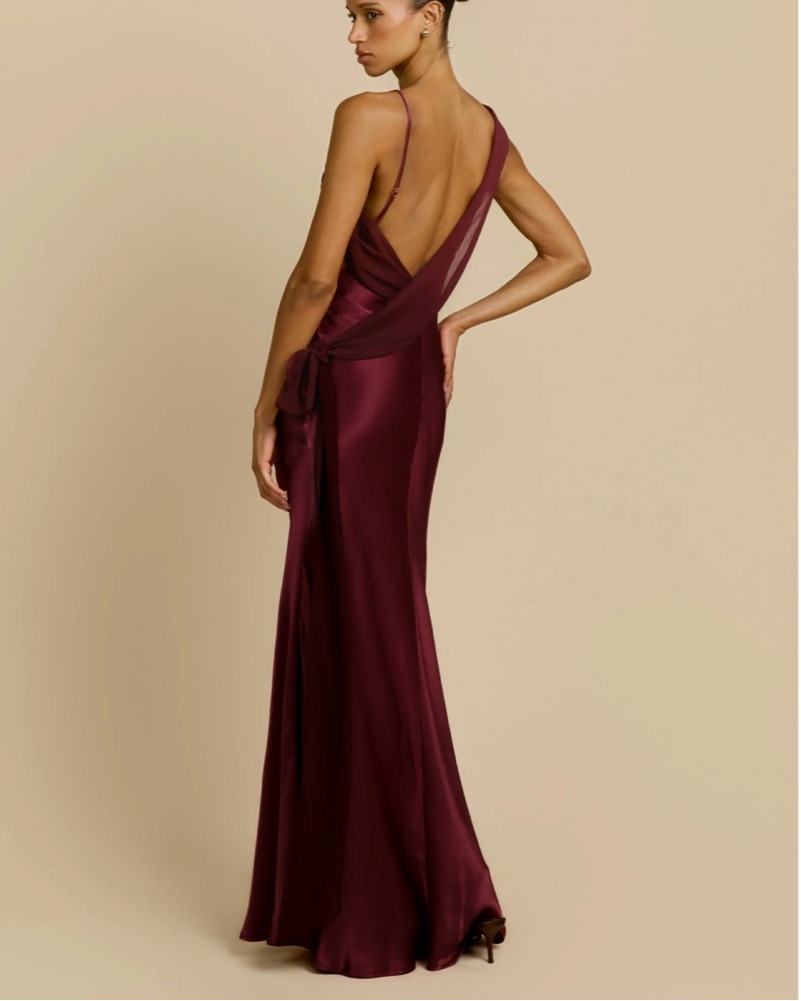 rich plum satin and chiffon sash gown made for black tie wedding guest, galas, formals or any special occasion! website model wearing xs and 5’10